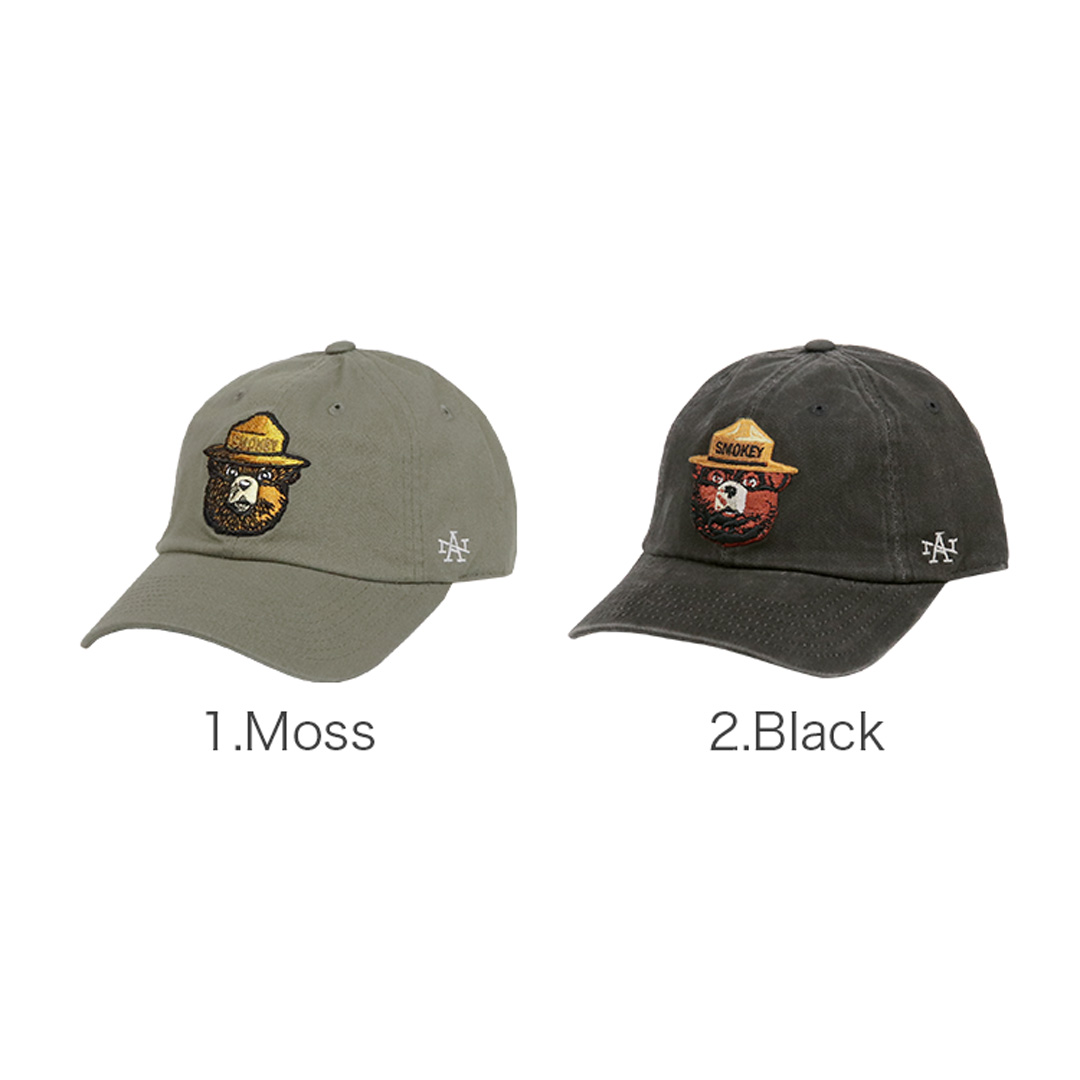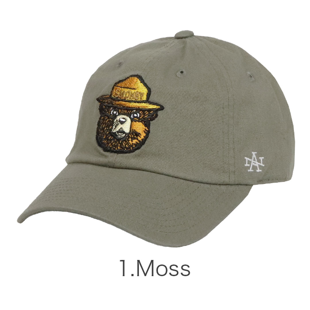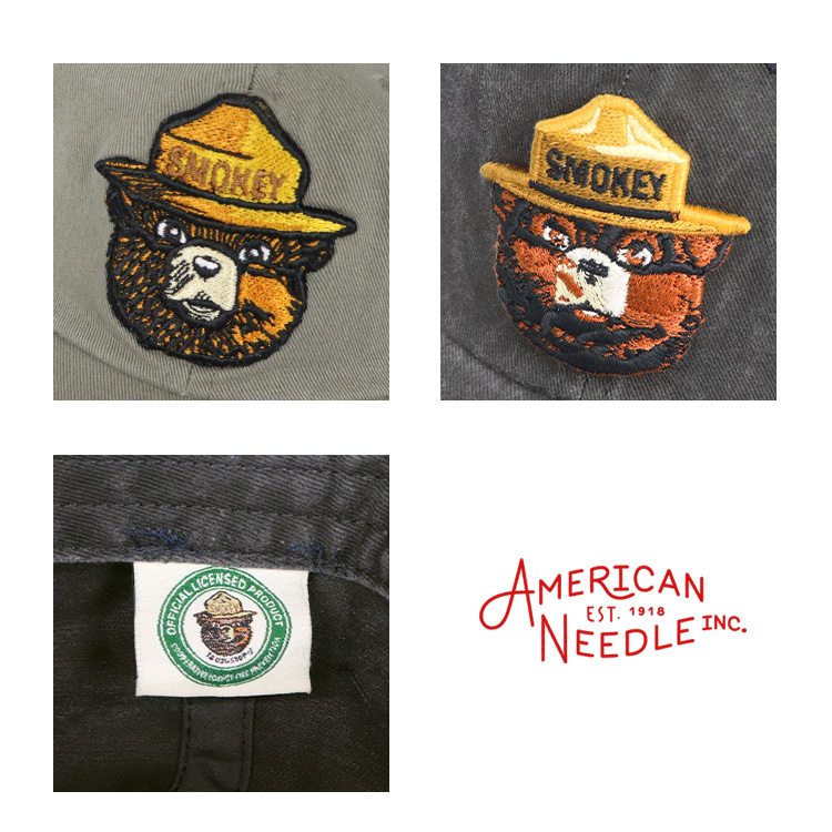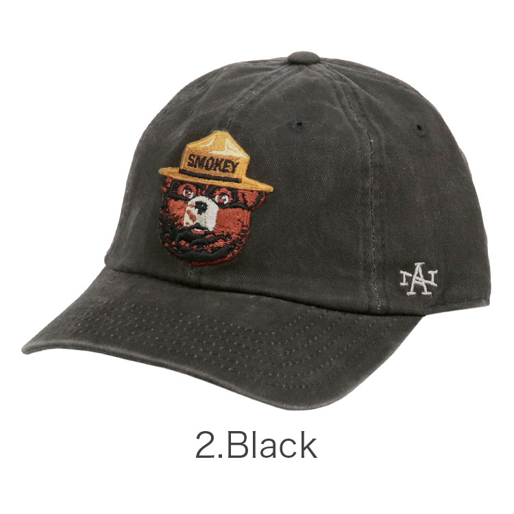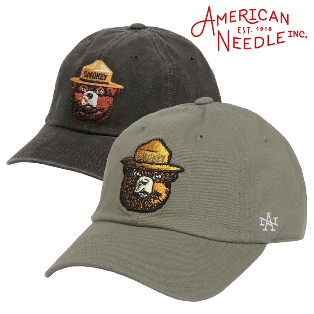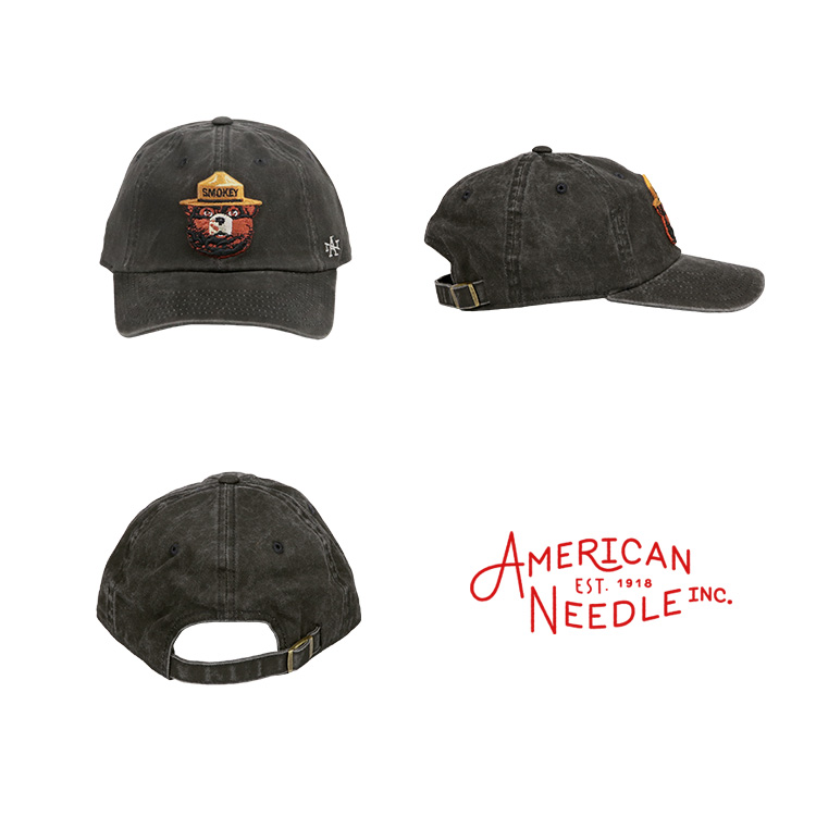 アメリカンニードルから、アメリカの森林火災防止キャンペーンのマスコットキャラクター、スモーキー・ベアのローキャップが入荷。アメリカ国内で絶大な知名度と人気を誇る熊をモチーフとしたキャラクターです。モス(カーキ)は少し洗い加工がかかったウォッシュドコットンのボディ、フロントにスモーキーベアの刺繍が施されたシンプルで愛らしいデザイン。ブラックは強めのウォッシュ加工、より立体的な刺繍、ツバ裏にイラストとスローガンがプリントされたかっこいいデザイン。どちらも抜け感のあるオシャレなアイテムです。