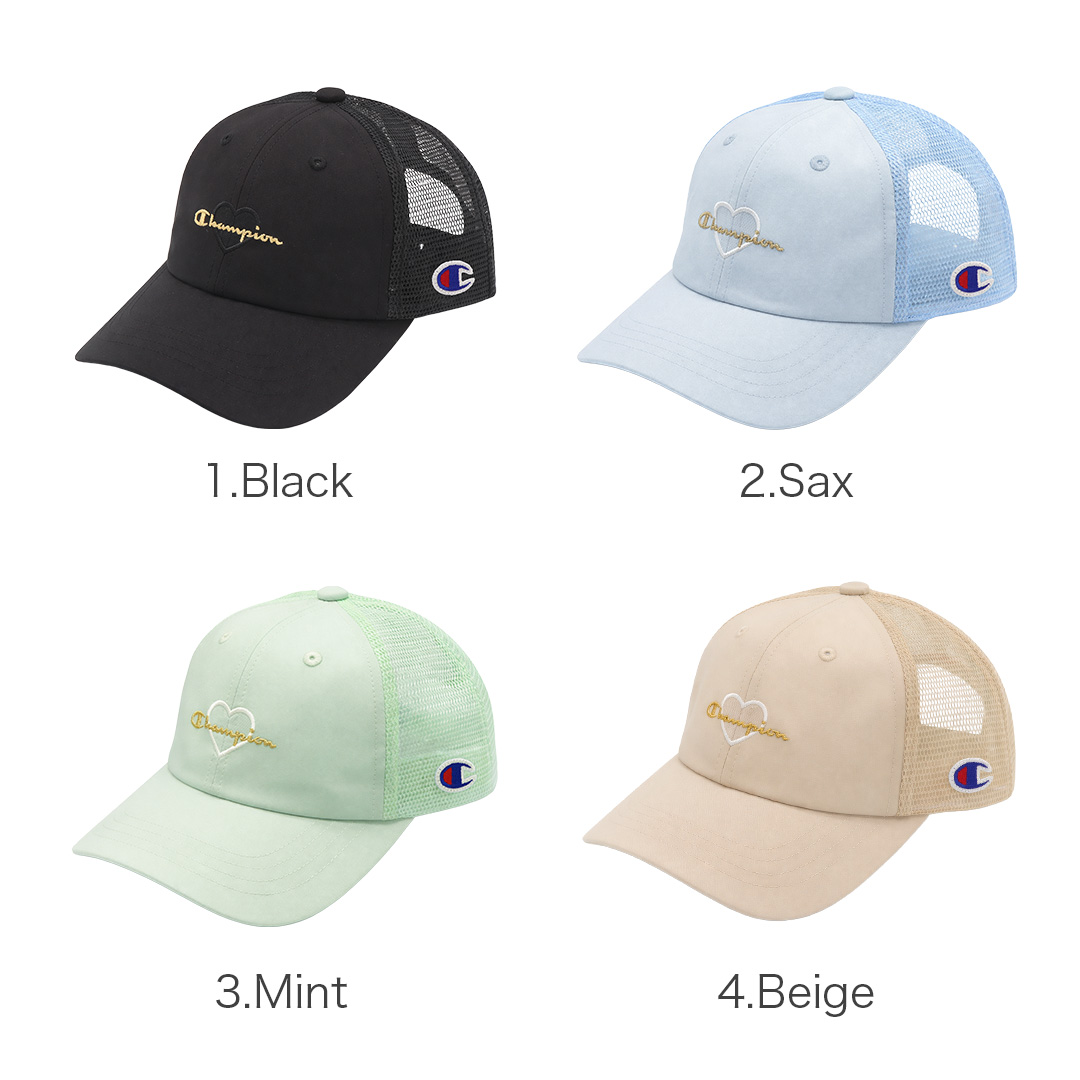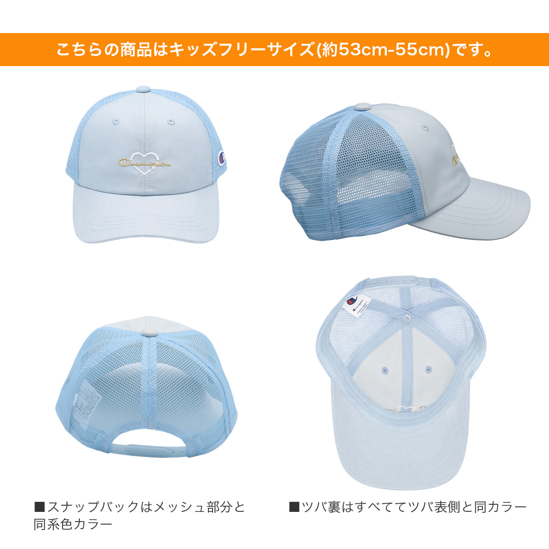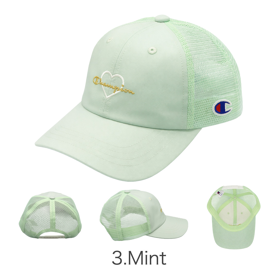 Champion/チャンピオンより、日差しから守りながら、おしゃれも楽しめるガールズメッシュキャップが入荷しました。マットサテン風のなめらかな生地に、ハート型のワッペン×ラメ糸刺繍をあしらった、リッチな雰囲気の甘辛ミックスデザイン。