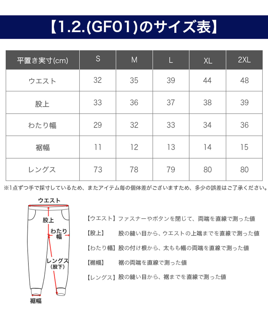 GF01:S 32/33/29/11/73・M 35/36/32/12/78・L 39/37/33/13/79・XL 44/38/34/14/80・2XL 48/39/36/15/80