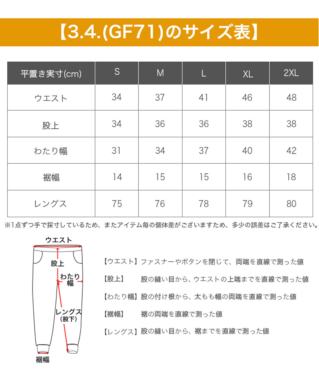 GF71:S 34/34/31/14/75・M 37/36/34/15/76・L 41/36/37/15/78・XL 46/38/40/16/79・2XL 48/38/42/18/80