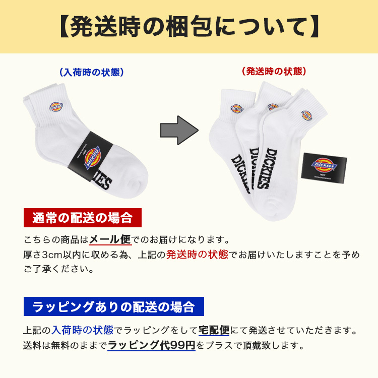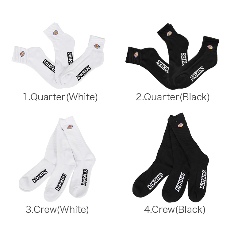Dickies/ディッキーズから、まとめ買いでお得な3足組6枚セットのロゴ刺繍ソックスが入荷。スタンダードな丈感でスニーカーやサンダルと相性の良いクォーターソックスと、少し長めのリブで紳士的にもスケーターっぽくも履けるクルーソックスの2種類の丈をご用意。 足底部分に採用されたタオル地(パイル編み)が肌触りの良いクッションになっており、足裏の疲労を軽減。定番人気で使いやすい白/黒の展開で、コスパが高くファッション性・機能性に優れた、プレゼントにもオススメのアイテムです。
