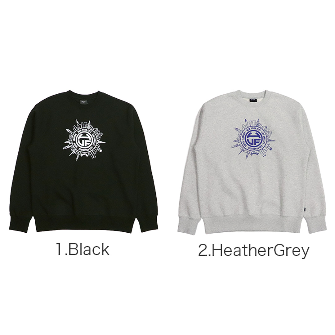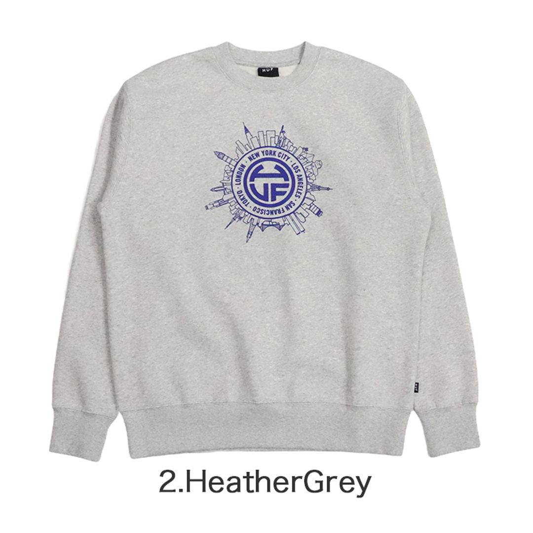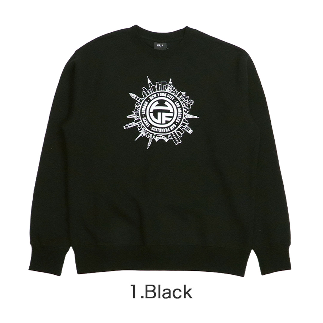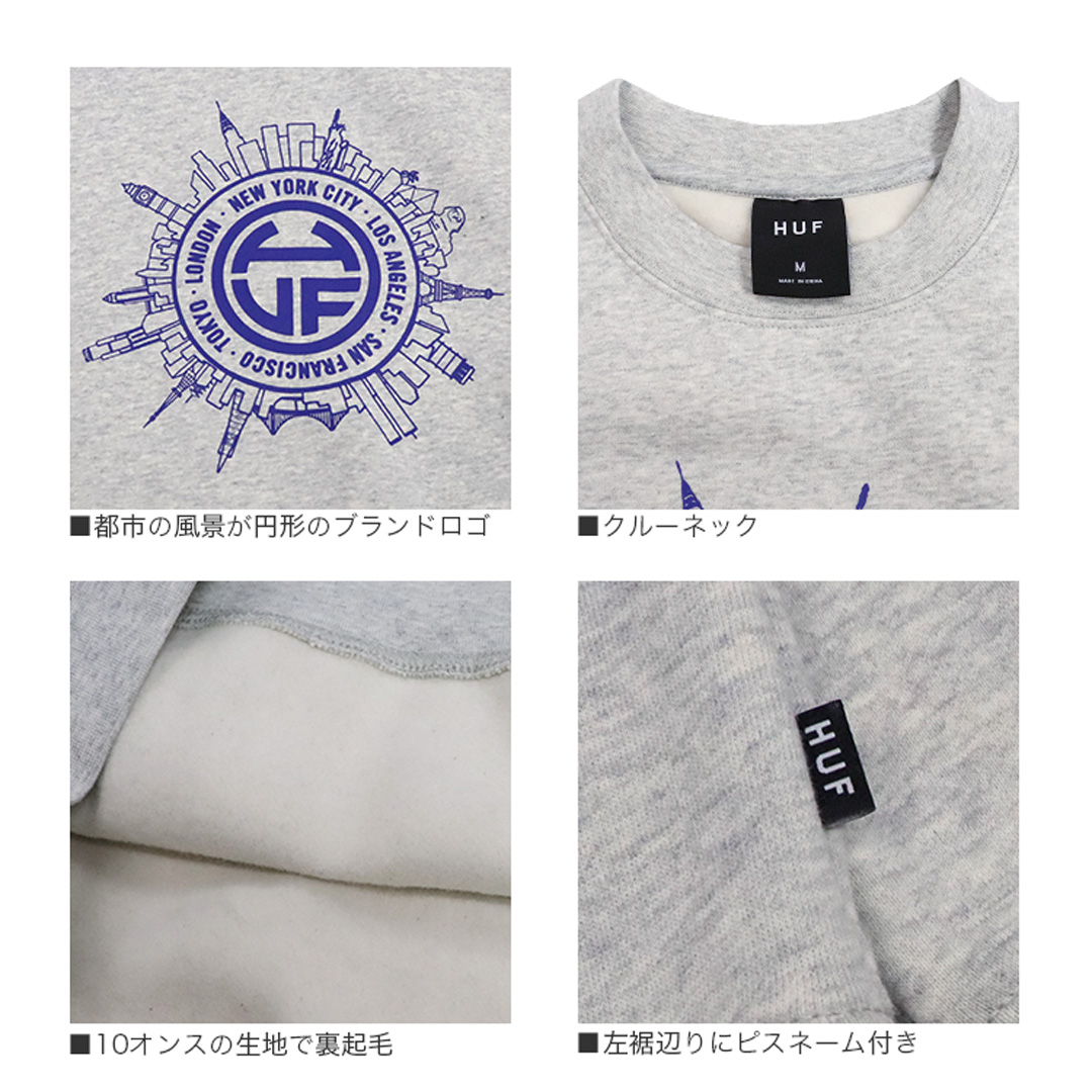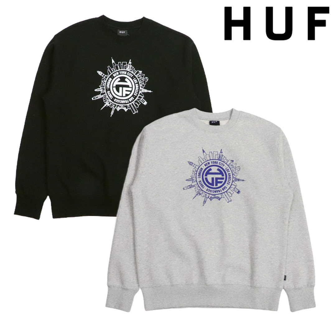 人気スケーターブランドのHUF/ハフから、スウェットシャツが入荷。ニューヨーク、ロサンゼルス、サンフランシスコ、東京、ロンドンなどの都市の風景が円形のブランドロゴの周囲に描かれた、ワールドワイドなデザイン。クルーネック(丸首)に、リブ付きの袖・裾などベーシックな作り。10オンスの生地は裏起毛になっており、肌ざわりなめらかで秋冬のストリートファッション・コーデに◎ 大きめにビッグシルエットで着こなすのがトレンド♪