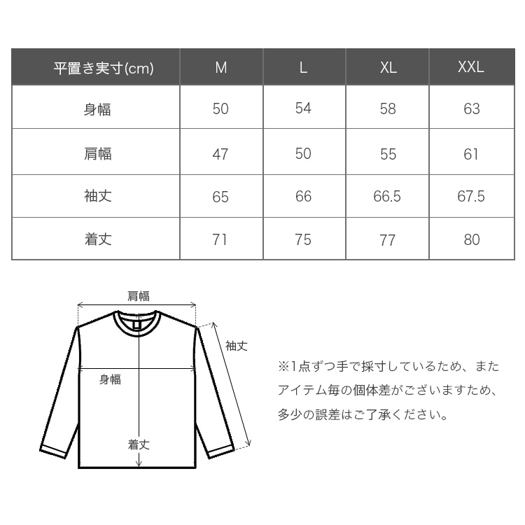 平置き実寸(cm)[身幅/肩幅/袖丈/着丈]:Mサイズ 50/47/65/71・Lサイズ 54/50/66/75・XLサイズ 58/55/66.5/77・XXLサイズ 63/61/67.5/80※多少の誤差はご了承ください