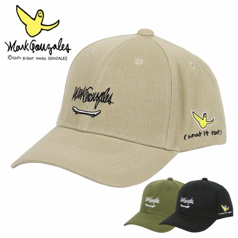 人気スケーターブランドの(What it isNt) ART BY MARK GONZALES/マーク・ゴンザレスから、ベースボールキャップが入荷。フロントにスケートボードとブランドロゴ、サイドにマーク・ゴンザレス本人が手がけた音楽アルバム「(What it isNt)」の文字とアイコンである「エンジェル」が刺繍された、シンプルでポップなデザイン。ストリート/カジュアル系のファッション・コーデにオススメです。芯ありのしっかりとしたフロントパネル、ツバは曲げられたカーブバイザー。少し深めの着用感、後部のスナップバックアジャスターでサイズ調整が可能。ユニセックスで着用いただけます。