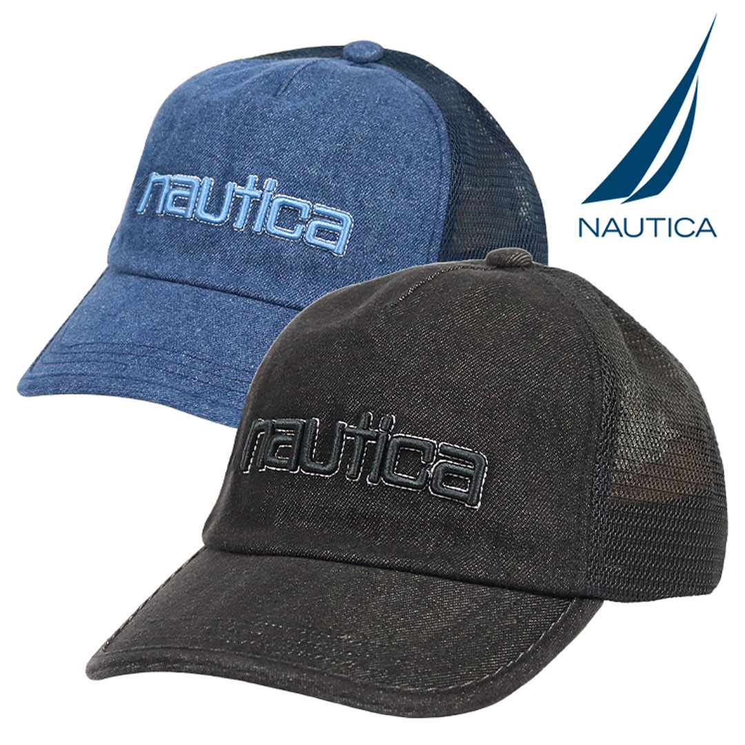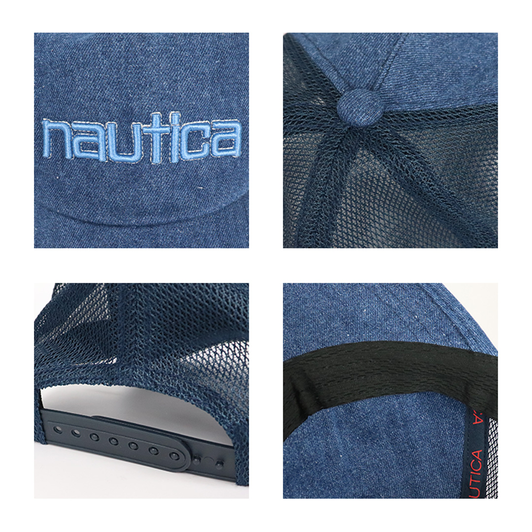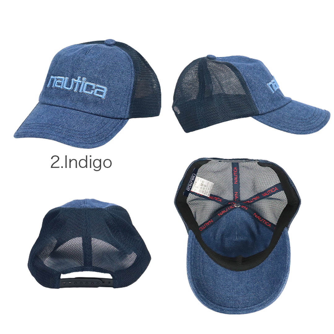 NAUTICA/ノーティカから、VINTAGE COLLECTIONのメッシュキャップが入荷。爽やかなデニム生地のフロントに、80~90年代のブランドロゴをリバイバルした所謂「小文字ロゴ」が立体刺繍でオン。全体にクタっとした質感と浅めの着用感がイナタい雰囲気で、ブランドの特色であるプレッピースタイル/マリンルック/ストリートファッションによく合うデザインのアイテムです。芯なしの柔らかいフロントパネル、ツバは元々曲げられたカーブバイザー。後部のストラップバックでサイズ調整が可能。通気性はもちろん、スベリ部分(肌との接地面)は吸水速乾なので快適さも◎