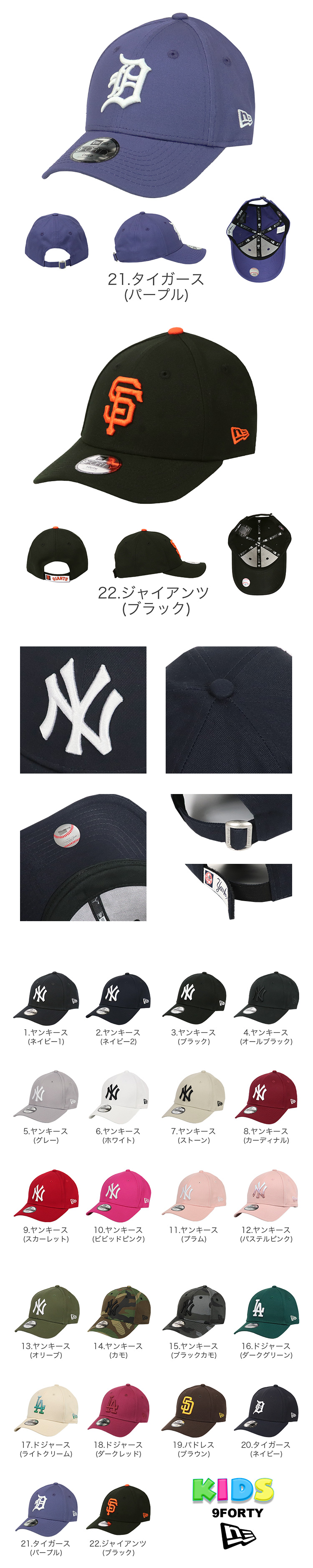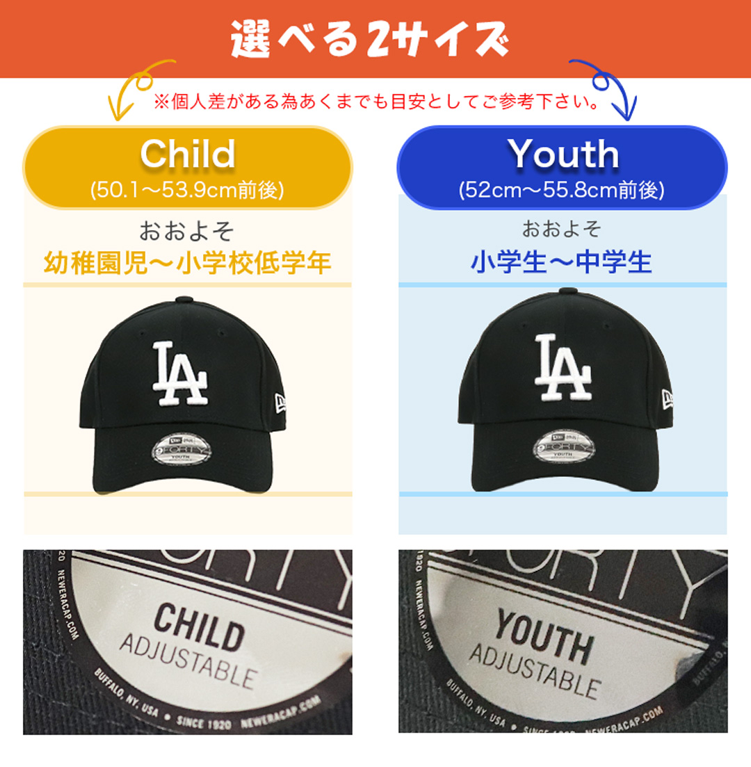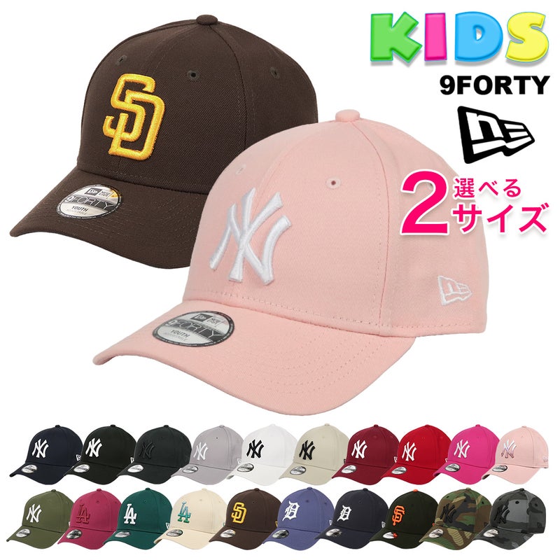 NewEra/ニューエラの9FORTYから、キッズサイズの6パネルキャップが入荷。MLB/メジャーリーグベースボール人気球団のチームロゴがフロントに刺繍された、幅広いファッション・コーデに合わせやすい王道ヘッドウェア。ツバはあらかじめ曲げられたカーブバイザー、芯ありのしっかりとしたフロントパネル、後部のアジャスターでサイズ調整が可能なのでプレゼントにもオススメです。