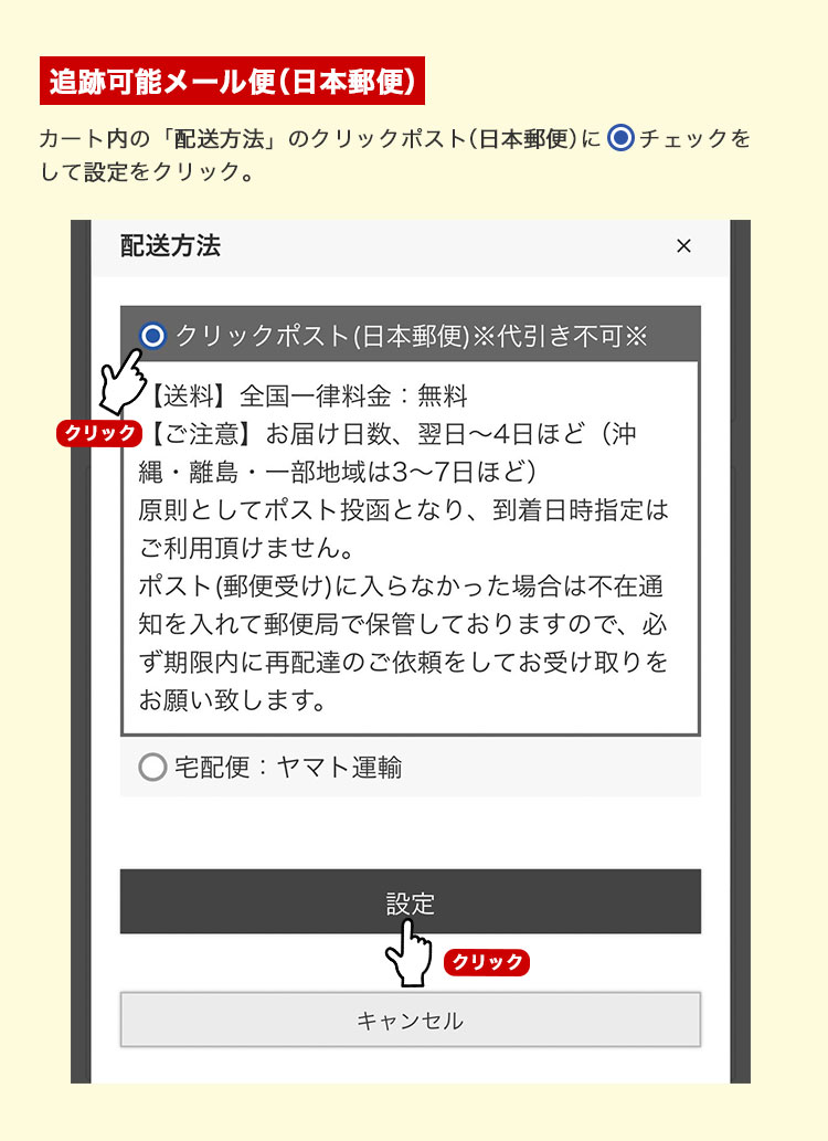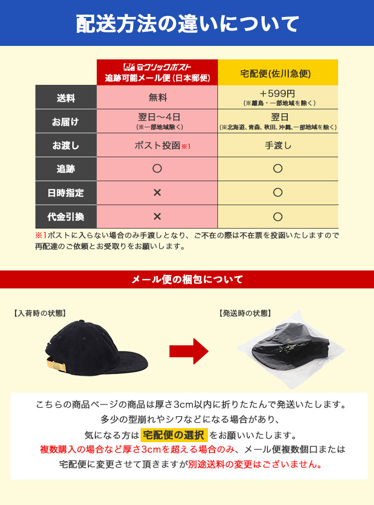 こちらの商品はメール便(クリックポスト)で発送させて頂きます。複数点購入などで厚みが3cmを超える場合は複数個口または宅配便に変更させて頂きますが、送料の追加などはございませんのでご安心ください。※宅配便商品と同時購入の場合は宅配便商品の送料が適応されます。