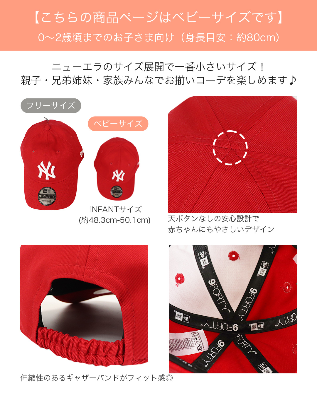 NewEra/ニューエラ 9FORTYシリーズより、豊富なラインナップの中でも最小となる、ベビーサイズ(INFANT/MY1ST)の6パネルベースボールキャップが入荷しました。フロントパネルには、硬すぎず柔らかすぎない程よいハリ感の芯地を採用。安全性に配慮しトップボタンを省き、後部はストレッチ性のあるギャザーバンド仕様で、小さいお子様にも安心して着用していただけます。