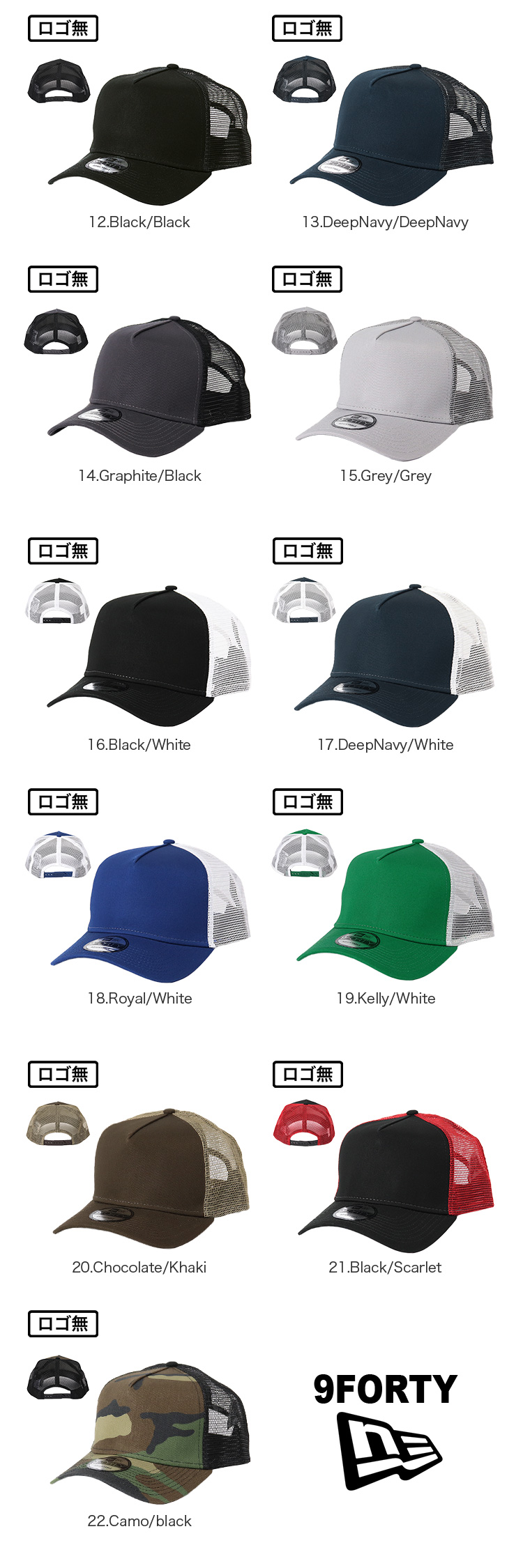 NewEra/ニューエラ 9FORTY(940)シリーズから、シンプルな無地の6パネルメッシュキャップが入荷。サイドにNEフラッグロゴ刺繍を配したワンポイントタイプと、装飾を省いたロゴなしのブランクタイプの2種類からお選びいただけます。定番のベーシックカラーに加え、ボディとメッシュ部分の配色が異なるツートーンタイプまで、幅広いカラーバリエーションをラインナップ。