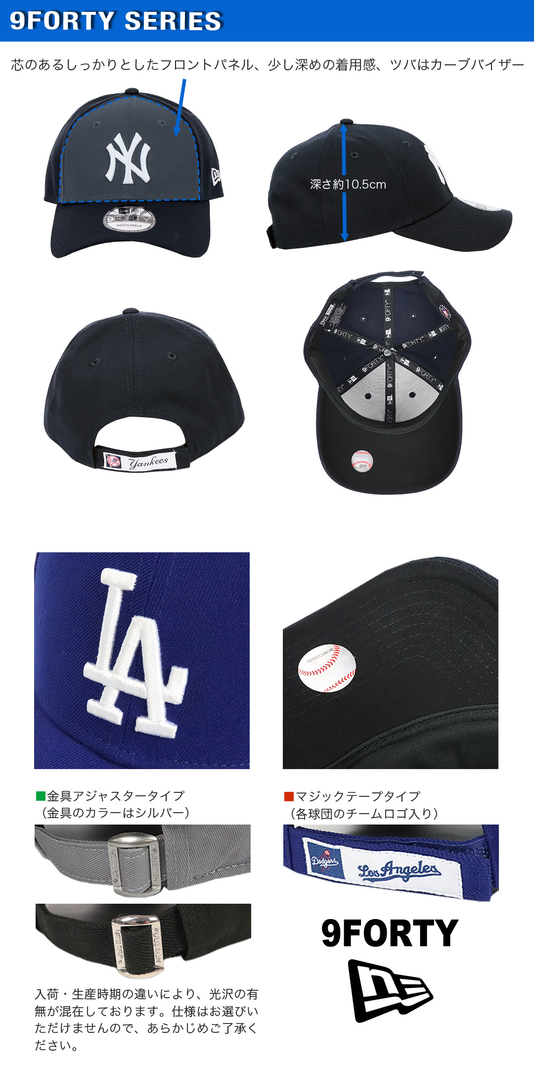 NewEra/ニューエラの9FORTYシリーズから、MLB/メジャーリーグベースボールの人気球団、NEW YORK YANKEES/ニューヨーク・ヤンキースとLOS ANGELES DODGERS/ロサンゼルス・ドジャースのチームロゴがフロントに刺繍された6パネルキャップが入荷。定番のNY/LAロゴに、チームカラーをはじめとしたカジュアルで合わせやすいカラーバリエーションで、幅広いファッション・コーデにオススメ。ツバはあらかじめ曲げられたカーブバイザー、芯ありのしっかりとしたフロントパネル、後部のアジャスターでサイズ調整が可能なので男女兼用で着用いただけます。