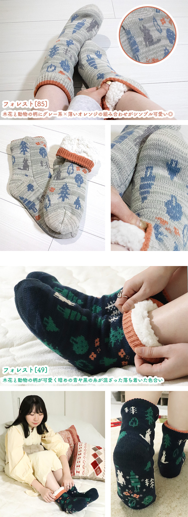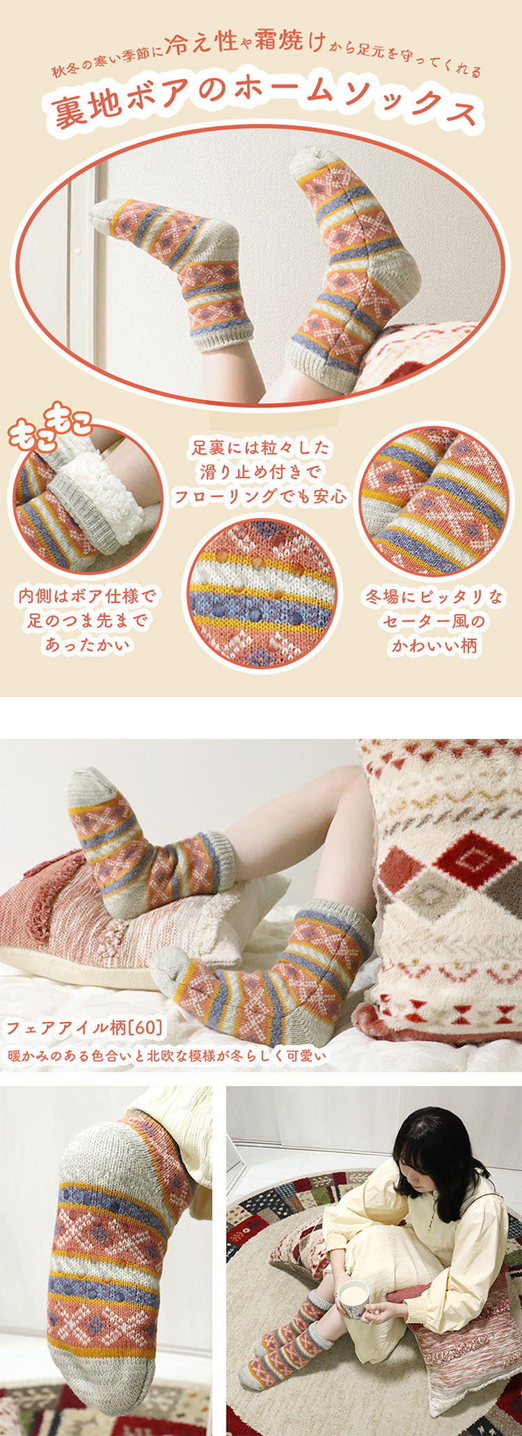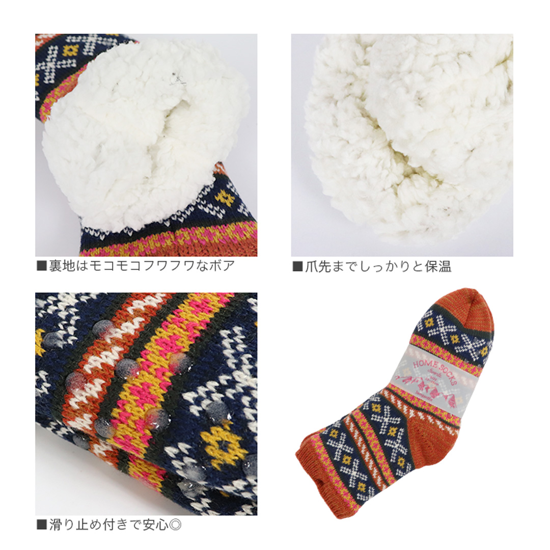 秋冬の寒い季節に冷え性や霜焼けから足元を守ってくれる、裏地ボアのホームソックスが入荷。モコモコのボアが爪先からふくらはぎ辺りまで包むので、フローリングや畳など床の冷たさを遮断し、体の熱を保って芯から暖めます。足裏(床との接地面)に滑り止めがついているので、ニット生地でもスベって転ぶ心配もありません。冬場にピッタリなセーター風のかわいい柄で、見た目にも暖かくオシャレ◎ プレゼント・ギフトにもオススメです。