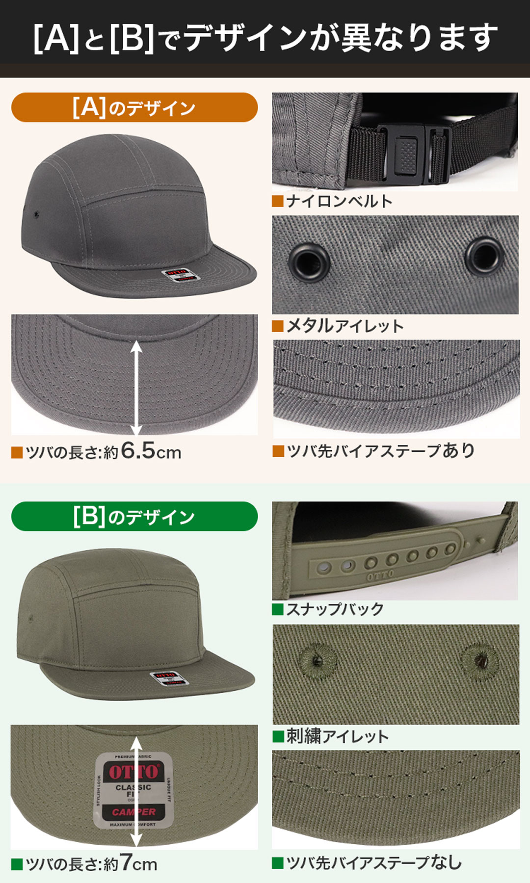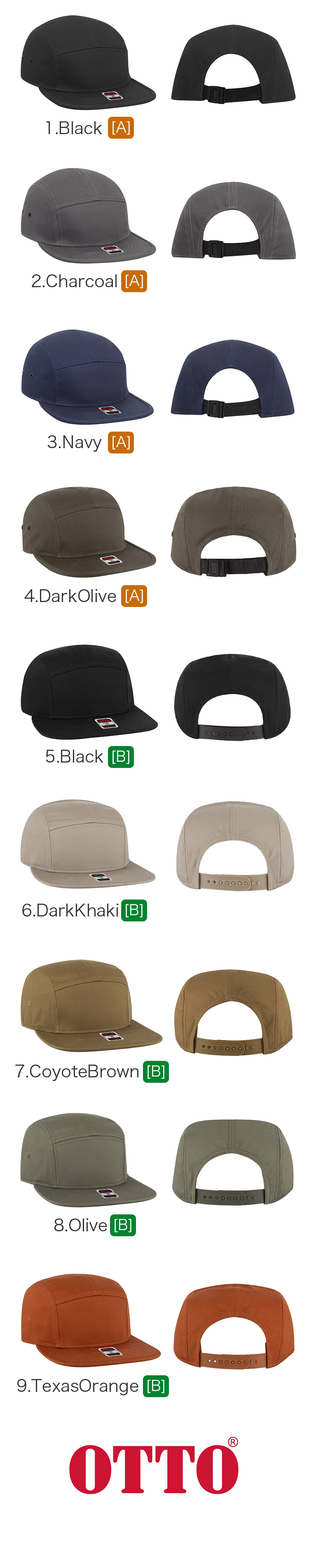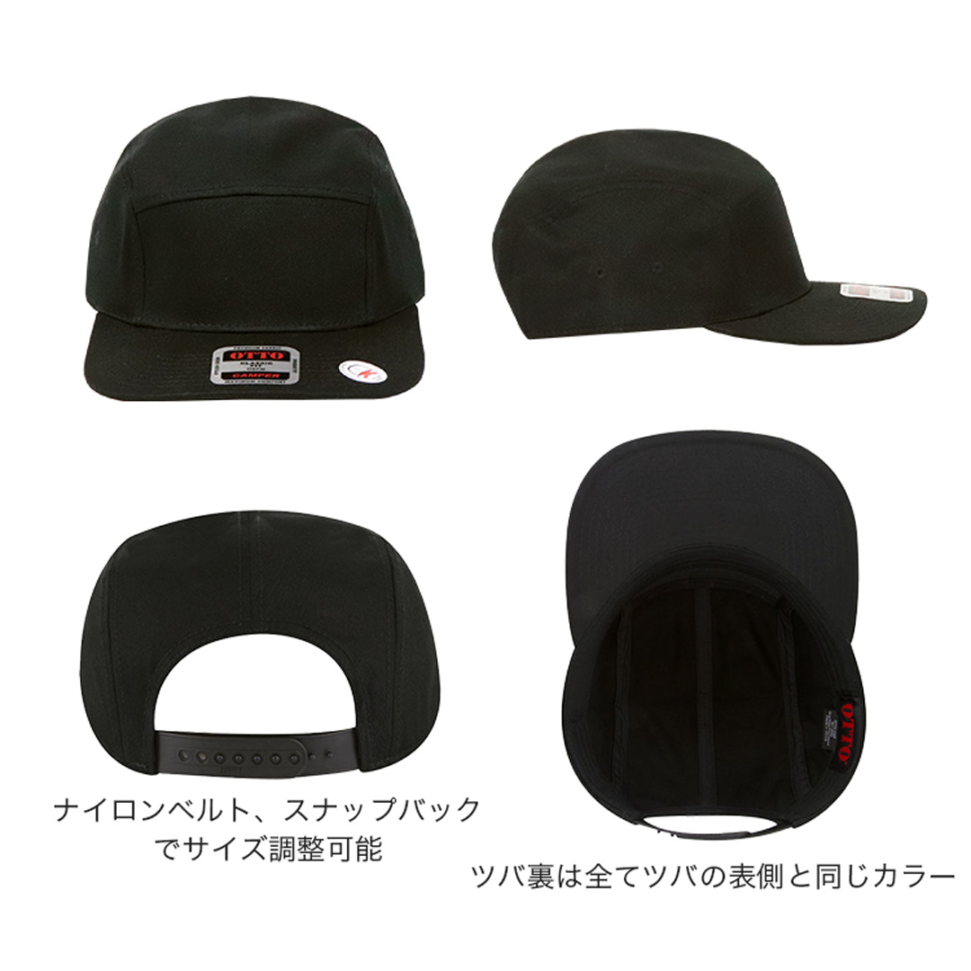OTTO/オットーから、5パネルキャップが入荷。シンプルな無地のボディ、ツバは真っすぐなフラットバイザー(平ツバ)、芯ありのしっかりとしたフロントパネル。定番のコットンツイルで軽くサラッと爽やかな生地感。幅広いファッションスタイルに合わせやすく、オリジナル刺繍/プリント等の素体としてもオススメのアイテム。後部のアジャスターでサイズ調整ができるので男女兼用で着用可能。