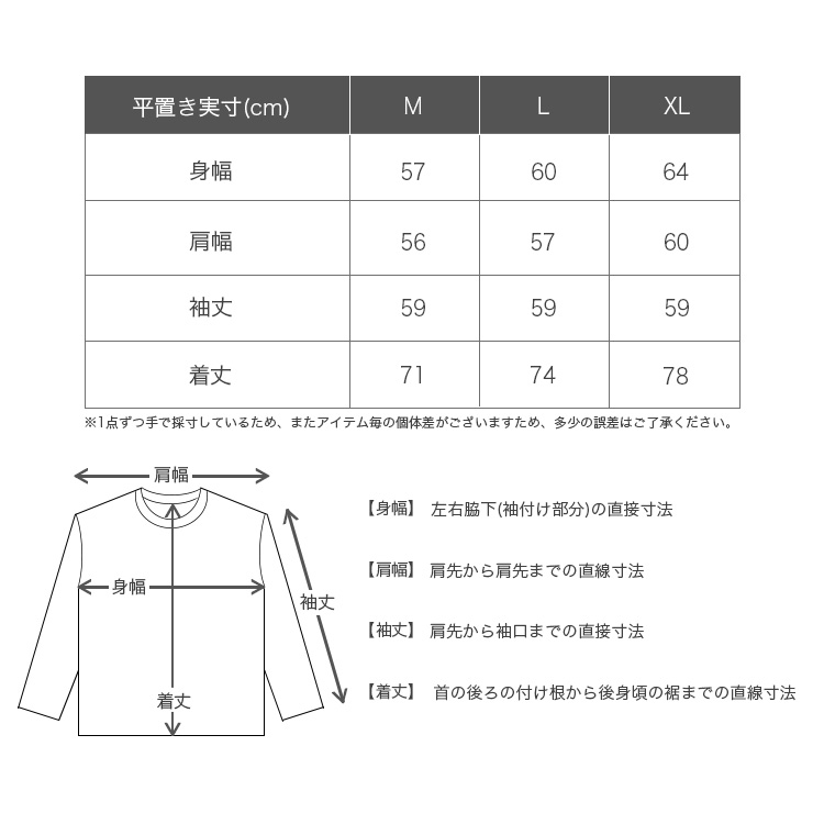 平置き実寸(cm)[身幅/肩幅/袖丈/着丈]:Mサイズ 57/56/59/71・Lサイズ 60/57/59/74・XLサイズ 64/60/59/78 ※多少の誤差はご了承ください