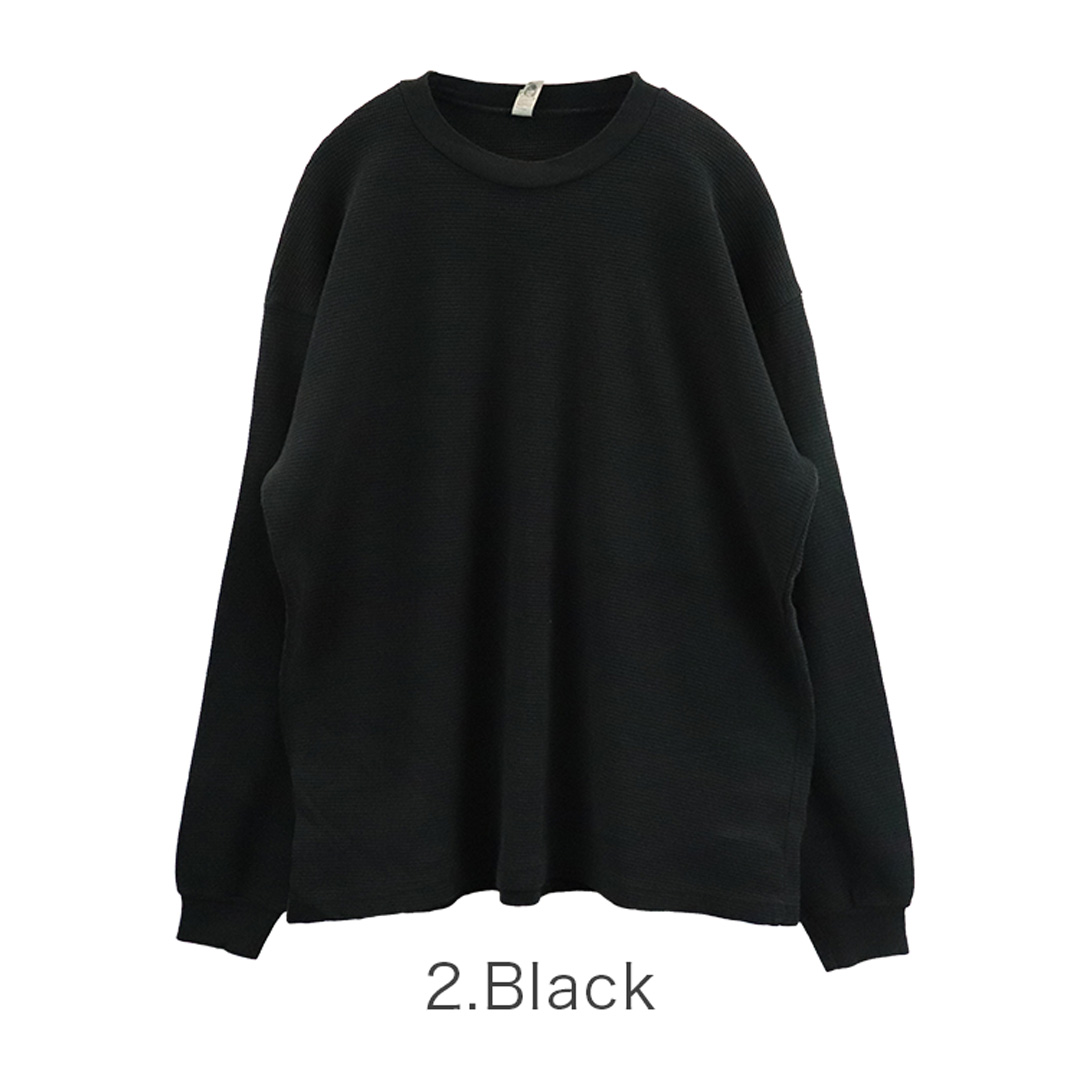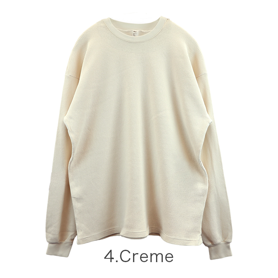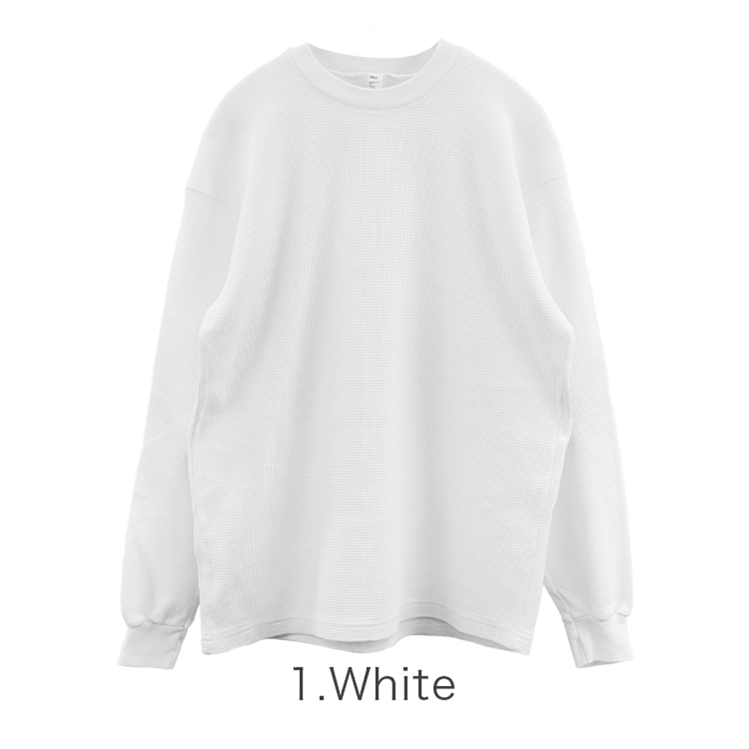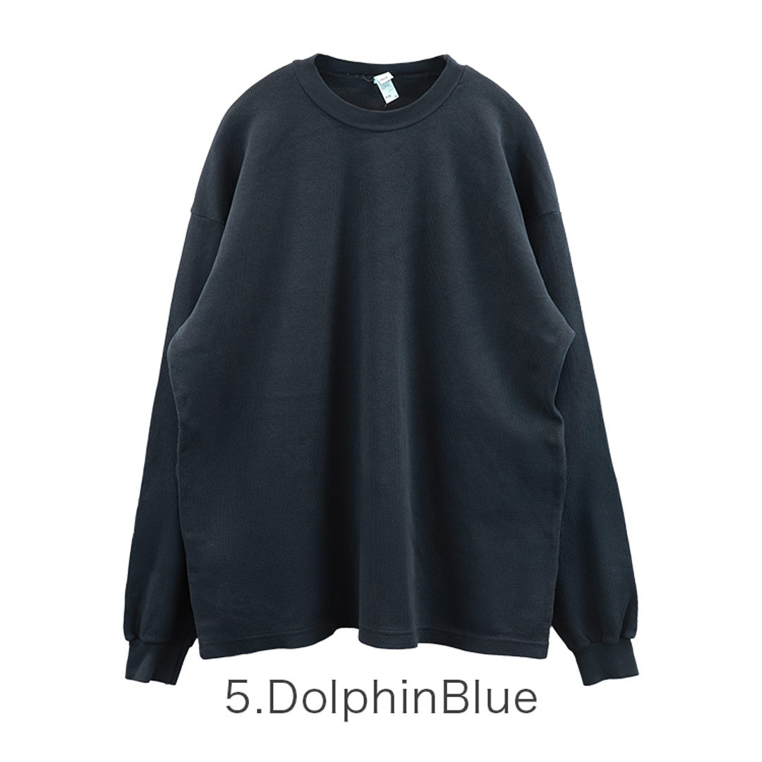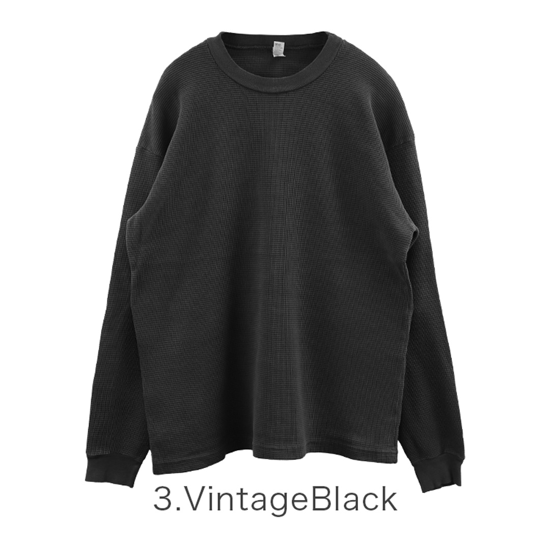 Los Angeles Apparel/ロサンゼルスアパレルから、シンプルな無地の長袖サーマルTシャツが入荷。一般的なインナー用サーマルに比べて生地に厚みとボリュームがあり、一枚着のトップスとしても着まわせる汎用性の高いアイテムです。また、製品染め(ガーメントダイ)とウォッシュ加工により、洗濯後も縮まないのが嬉しいポイント。