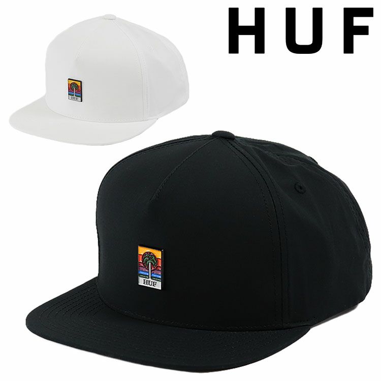 ヤシの木越しのサンセットビーチが描かれたメタルプレートがフロントパネルに配置されたHUFのキャップ。ハリのあるツルっとしたコットン素材がスペシャル感を演出。フロントパネルは芯のあるタイプです。