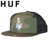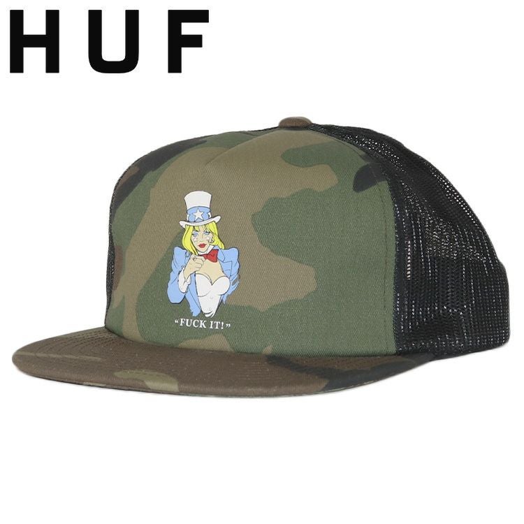 スケーターはもちろん幅広い層から人気のスケートブランドHUFから、メッシュキャップ/トラッカーキャップが入荷。フロントにはアメリカンガールがプリント。ウッドランドパターンの迷彩のボディとブラックのメッシュがかっこいい。フロントパネルは芯のないタイプだがある程度の形はキープされている。ツバは真っすぐなフラットバイザー、後部のスナップバックでサイズ調整が可能。