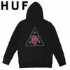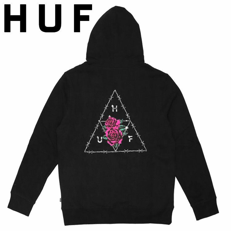 スケートブランドの枠を超えてストリートファッションの代表的ブランドにまでなったHUF/ハフから、人気アイテムのひとつプルオーバーパーカーが入荷。バックプリントされた有刺鉄線のトリプルトライアングルロゴとバラの組合せが最高にマッチ♪ブラックのボディとローズピンクのカラーリングもGOOD◎フロントの左胸にはレギュラーのトリプルトライアングルロゴがプリント、裏起毛で暖かくてバイヤーおすすめの1着です!