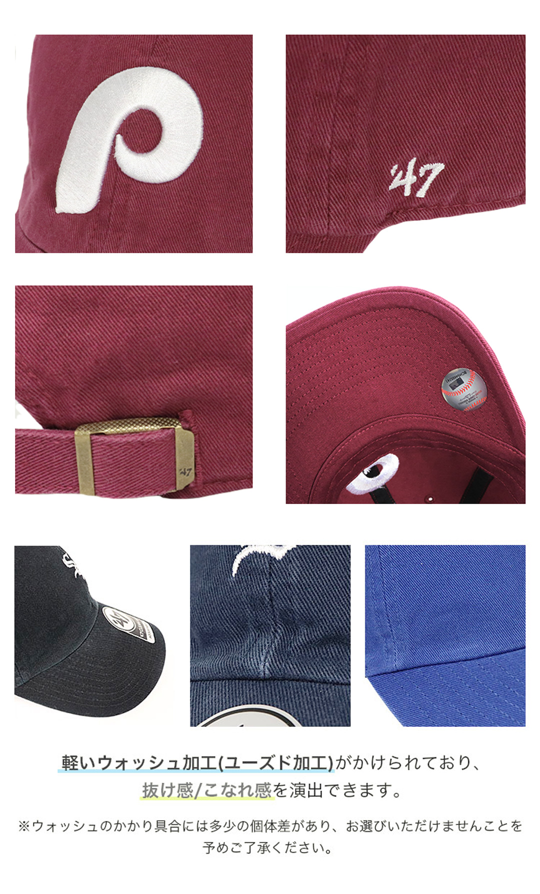 47/フォーティーセブンの定番人気モデル CLEAN UP シリーズから、メジャーリーグベースボール球団 PHILADELPHIA PHILLIES/フィラデルフィア・フィリーズの6パネルダッドハットが入荷。現在のチームカラーで彩られた青と赤のデザインと、MLB通算安打数歴代1位のピート・ローズが所属し初のワールドシリーズ制覇も成し遂げた常勝軍団時代、1970~80年代のチームロゴを採用したクーパーズタウンコレクション。ツバは曲げられたカーブバイザー、洗い加工がかかったウォッシュドコットンを使用、フロントパネルが柔らかく芯のない浅めのローキャップ、後部のストラップバックベルトでサイズ調整が可能なので男女兼用で着用いただけます。