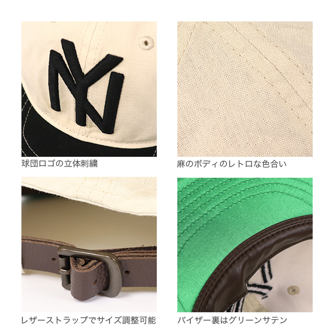 ラフな麻素材のクラウンに、高級感漂うレザーストラップ。フラットバイザーのツバ裏はグリーンのサテン生地を使用し、ヴィンテージライクな雰囲気に仕上がっています。男女問わずユニセックスでご着用いただける、細部までこだわりの詰まったアイテム。