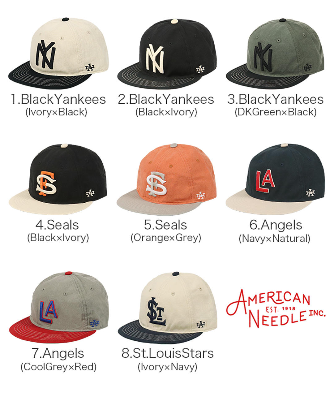 アメリカンニードルから、かつて存在した球団をモチーフにした、レトロな6パネルキャップが入荷。ニグロリーグ所属のニューヨーク・ブラックヤンキースとセントルイス・スターズ、マイナーリーグAAA級パシフィック・コーストリーグ所属のサンフランシスコ・シールズとロサンゼルス・エンゼルスの4球団にフューチャー。立体感のある刺繍ロゴが歴史へのリスペクトを感じさせます。