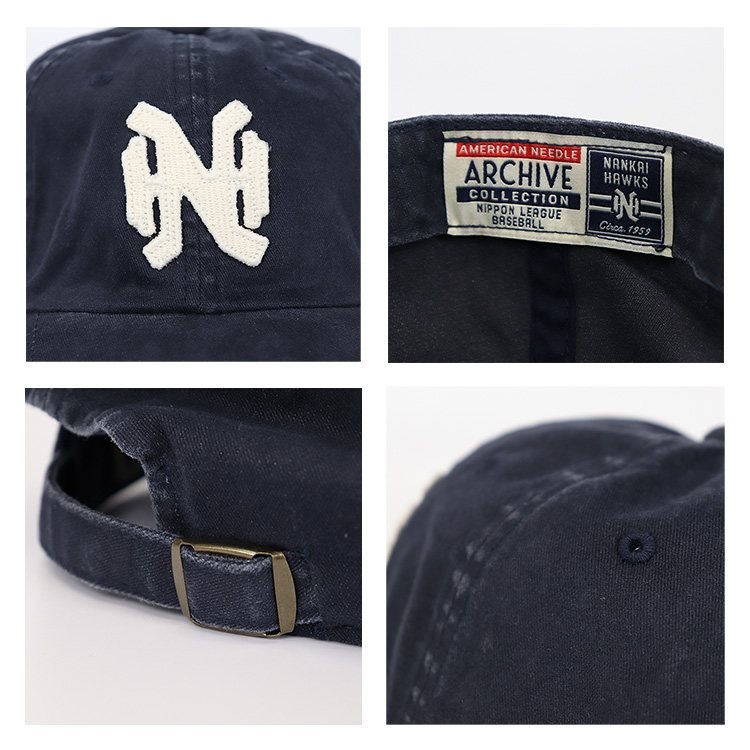 アメリカの老舗帽子ブランドのアメリカンニードルから、懐かしい日本のプロ野球チーム・南海ホークス(福岡ソフトバンクホークスの前身球団)の復刻デザインのローキャップが入荷。NとHの組合せのロゴがビンテージ感たっぷりで雰囲気があってかっこいい!ウォッシュ加工のかかったネイビー系のボディ、フロントパネルには芯がなく、ツバは曲げられたカーブバイザー、後部のストラップバックでサイズ調整が可能なので、メンズ・レディース問わずご着用頂けます。