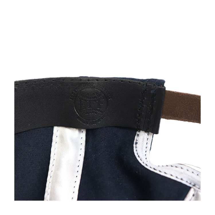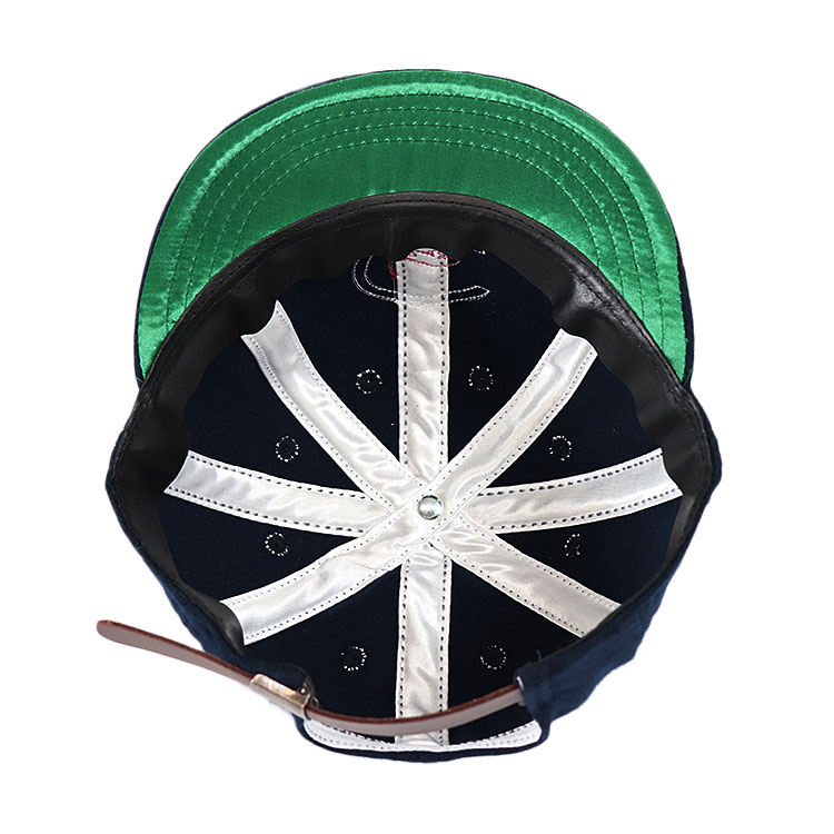 レザーストラップ・サテンテーピング・バイザー裏はグリーンサテンなどディテールにも徹底的にこだわった、ハンドメイドのアメリカ製。