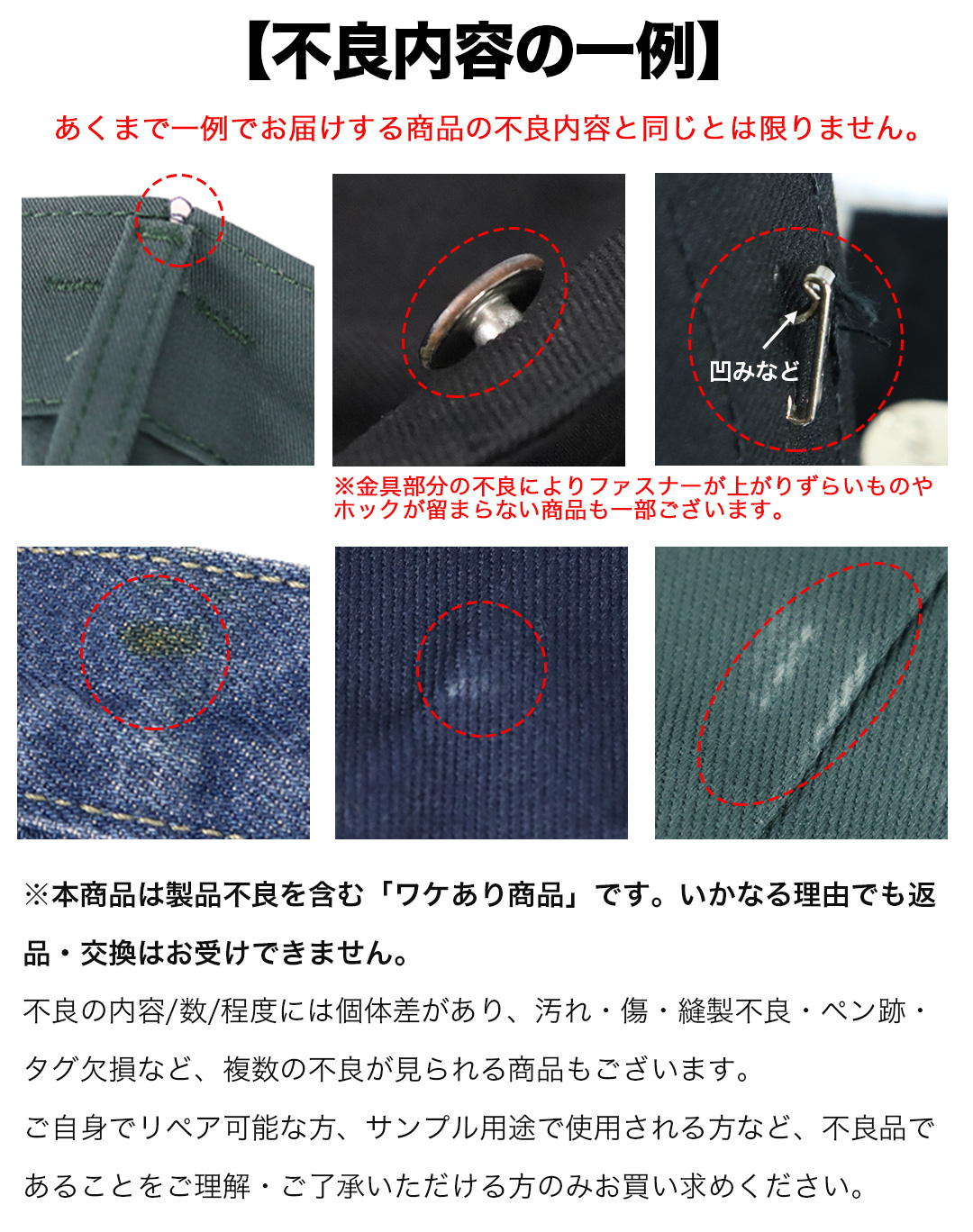 不良の内容・数・程度も様々で、汚れ・縫製不良・傷・ステッカーなどすべての種類の不良がある商品もあり、ご自身でリペア可能な方やサンプルとして使用される方など、不良商品であることをご了承頂ける方のみご購入くださいませ。