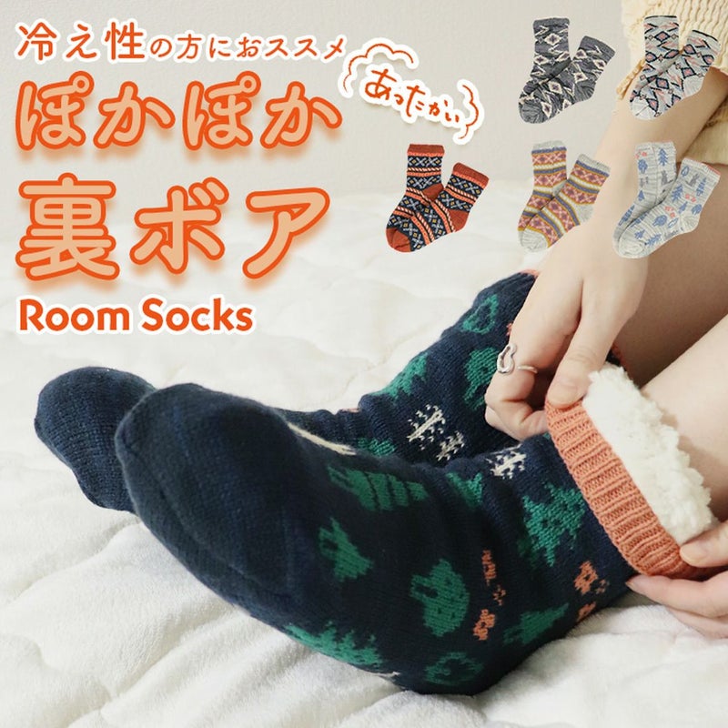秋冬の寒い季節に冷え性や霜焼けから足元を守ってくれる、裏地ボアのホームソックスが入荷。モコモコのボアが爪先からふくらはぎ辺りまで包むので、フローリングや畳など床の冷たさを遮断し、体の熱を保って芯から暖めます。足裏(床との接地面)に滑り止めがついているので、ニット生地でもスベって転ぶ心配もありません。冬場にピッタリなセーター風のかわいい柄で、見た目にも暖かくオシャレ◎ プレゼント・ギフトにもオススメです。