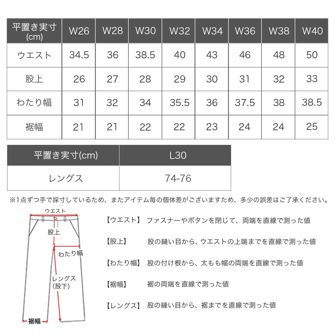 平置き実寸(cm)[ウエスト/股上/わたり幅/裾幅]