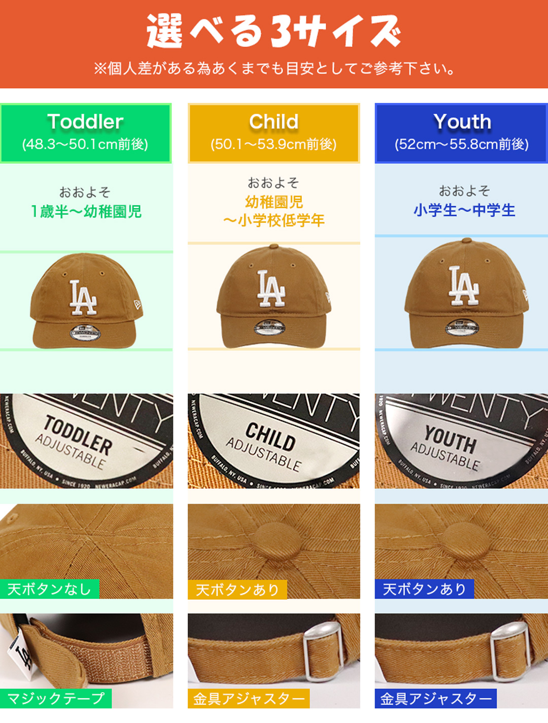トドラーフリーサイズ(48.3~50.1cm前後) ツバの長さ約6cm・深さ約9.5cm ※トドラーのみマジックテープアジャスター、天ボタン無しになります。