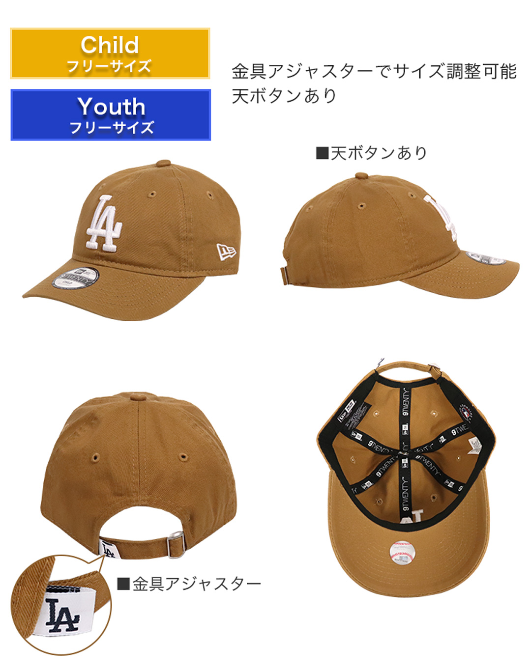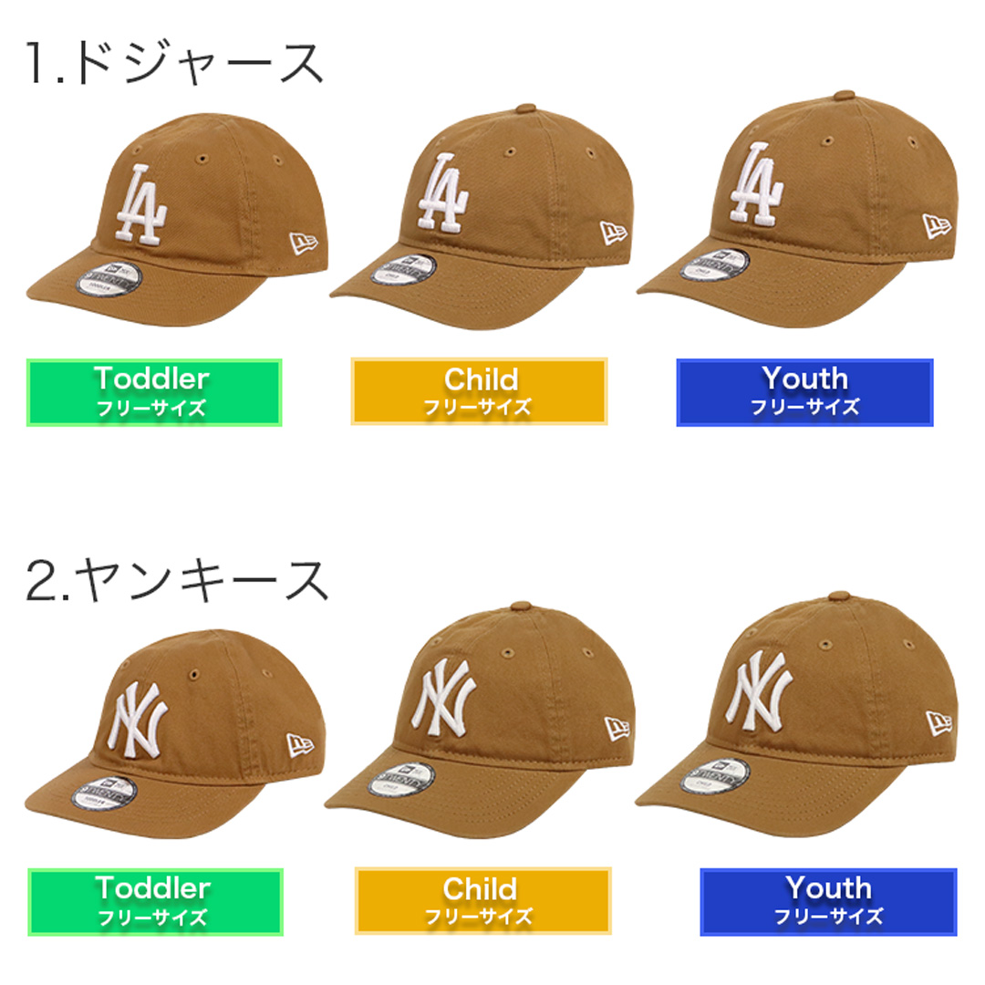 NewEra/ニューエラの9TWENTYシリーズから、キッズサイズの6パネルダッドハットが入荷。フロントにMLB/メジャーリーグベースボール人気球団 LOS ANGELES DODGERS/ロサンゼルス・ドジャース、NEW YORK YANKEES/ニューヨーク・ヤンキースのロゴ刺繍。大人用の9TWENTYをシルエットはそのまま子供用にリサイズした、幅広いファッション・コーデに合わせやすい王道ヘッドウェア。芯なしの柔らかいフロントパネル、ツバはあらかじめ曲げられたカーブバイザー、後部のアジャスターでサイズ調整が可能なのでプレゼントにもオススメ。