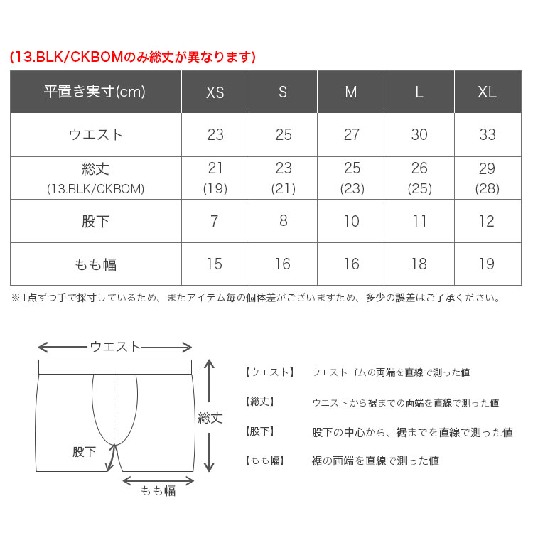 ※13.BLK/CKBOMのみ総丈が異なります:XS 19・S 21・M 23・L 25・XL 28