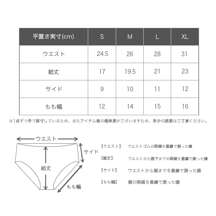 平置き実寸(cm)[ウエスト/総丈/サイド/もも幅]:S 24.5/17/9/12・M 27/19.5/10/14・L 27/21/11/15・XL 31/23/12/16※多少の誤差はご了承ください