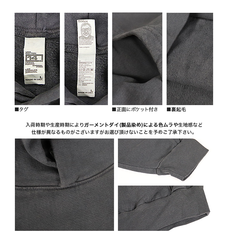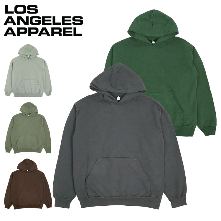 Los Angeles Apparel/ロサンゼルスアパレルから、プルオーバーパーカーが入荷。ガーメントダイ(製品染め)による自然な色ムラが独特の風合いを醸し出しており、洗っても縮みにくく型崩れしないシュリンクフリーなので、傷みを気にせず長く着用できる丈夫でオシャレなアイテムです。ヘビーフリースの生地は重さ14オンスと非常に肉厚で、肌寒い秋冬でも活躍間違いなし!シンプルな無地で幅広いスタイル・コーデに合わせやすく、春秋のアウターとしても、ブルゾンやコートのインナーとしてもOK、ボトムスは細くても太くてもラフに着こなすことができるオススメの一点。