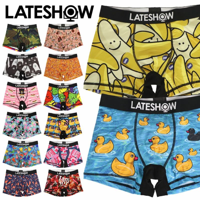 「一週間をシチュエーションごとにハイテンションに、毎日楽しく過ごせるアンダーウェア!」をコンセプトとする下着ブランド、LATESHOW(レイトショー)。チラッと見えるだけでもインパクト大の、ユニークな柄物ボクサーパンツが主力商品。ブランドコンセプト通り、今日はどれを履こうかな?とアンダーウェアからファッションを最大限に楽しませてくれる、ハイセンスなパンツが揃っています。プレゼントにもオススメ!