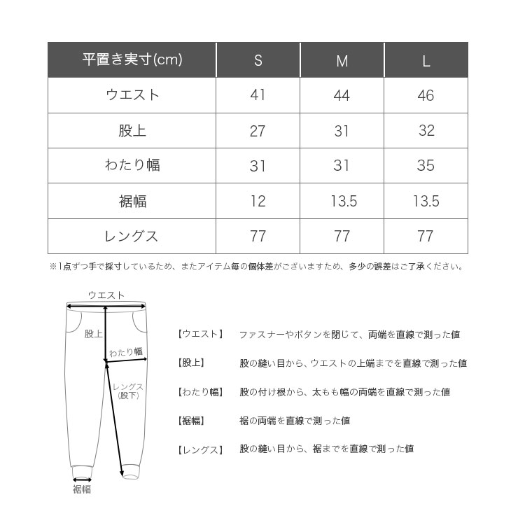 平置き実寸(cm)[ウエスト/股上/わたり幅/裾幅] Sサイズ 41/27/31/12・Mサイズ 44/31/31/13.5・Lサイズ 46/32/35/13.5 ※多少の誤差はご了承ください