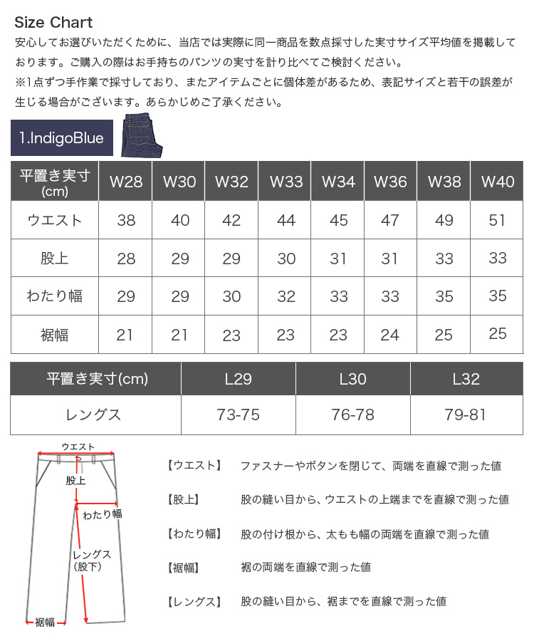 W28 38/28/29/21・W30 40/29/29/21・W32 42/29/30/23・W33 44/30/32/23・W34 45/31/33/23・W36 47/31/33/24・W38 49/33/35/25