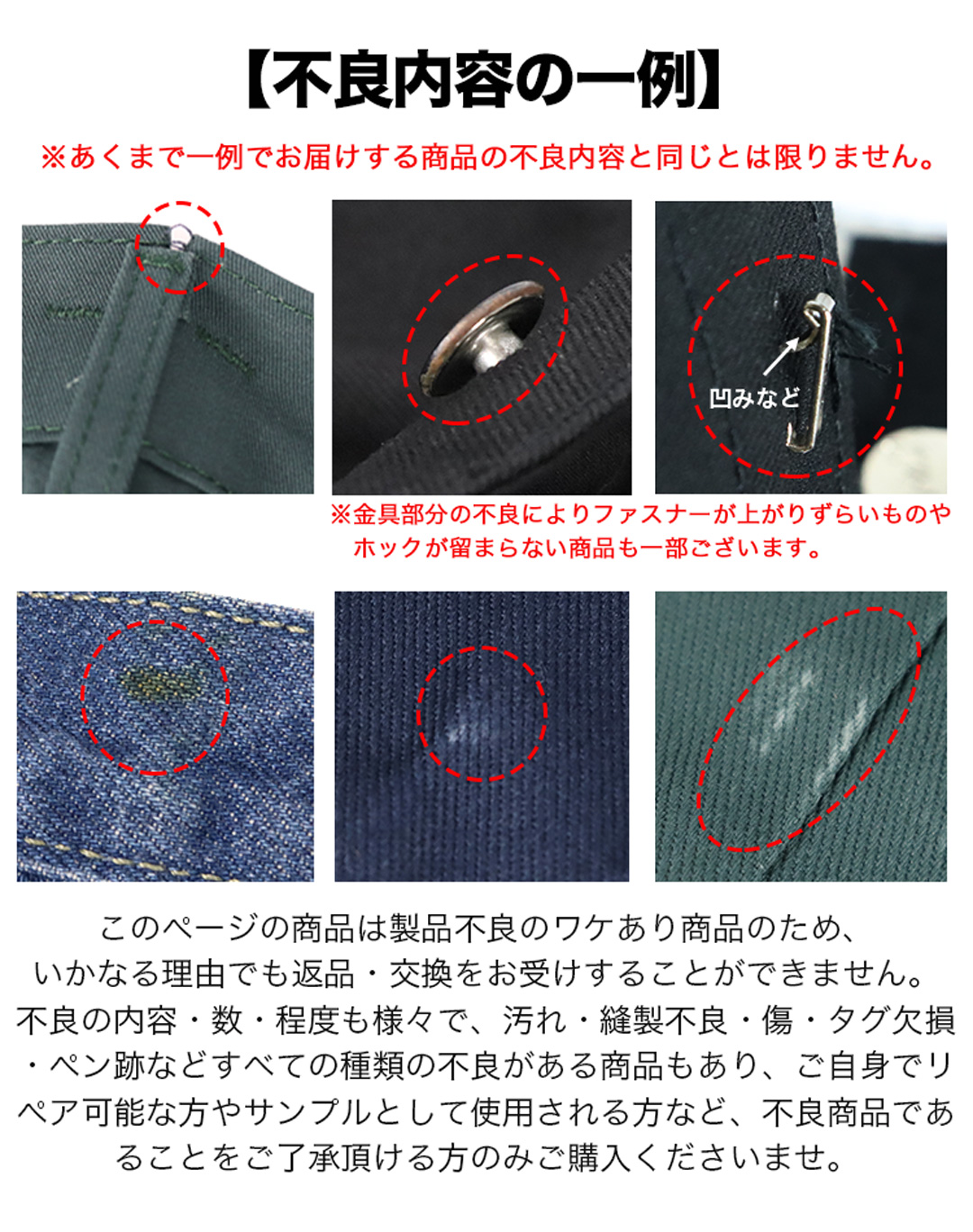 不良の内容・数・程度も様々で、汚れ・縫製不良・傷・ステッカーなどすべての種類の不良がある商品もあり、ご自身でリペア可能な方やサンプルとして使用される方など、不良商品であることをご了承頂ける方のみご購入くださいませ。