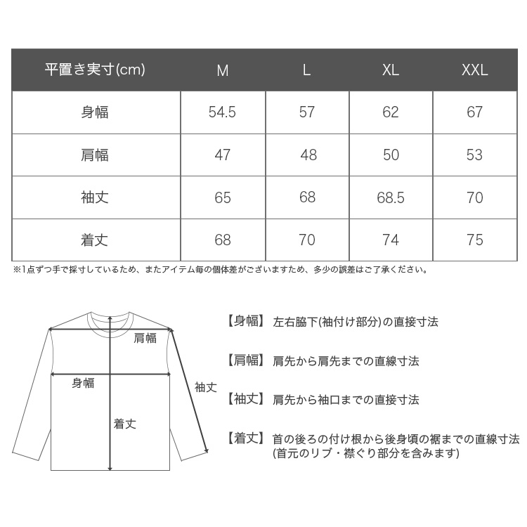 平置き実寸(cm)[身幅/肩幅/袖丈/着丈]:Mサイズ 54.5/47/65/68・Lサイズ 57/48/68/70・XLサイズ 62/50/68.5/74・XXLサイズ 67/53/70/75※多少の誤差はご了承ください