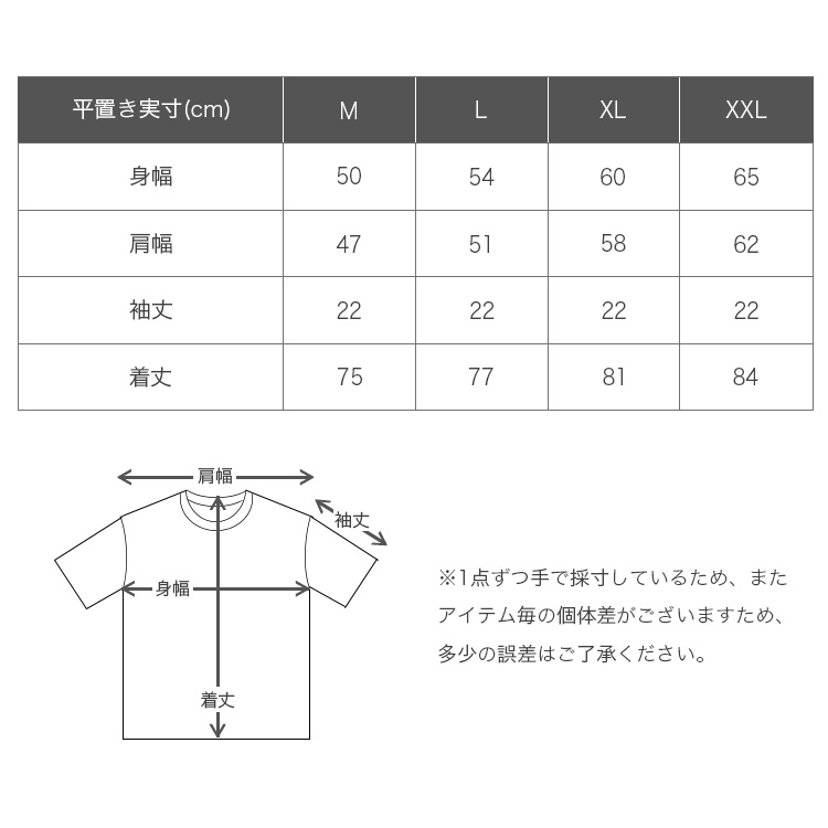 平置き実寸(cm)[身幅/肩幅/袖丈/着丈] M:50/47/22/75 L:54/51/22/77 XL:60/58/22/81 XXL:65/62/22/84※多少の誤差はご了承ください