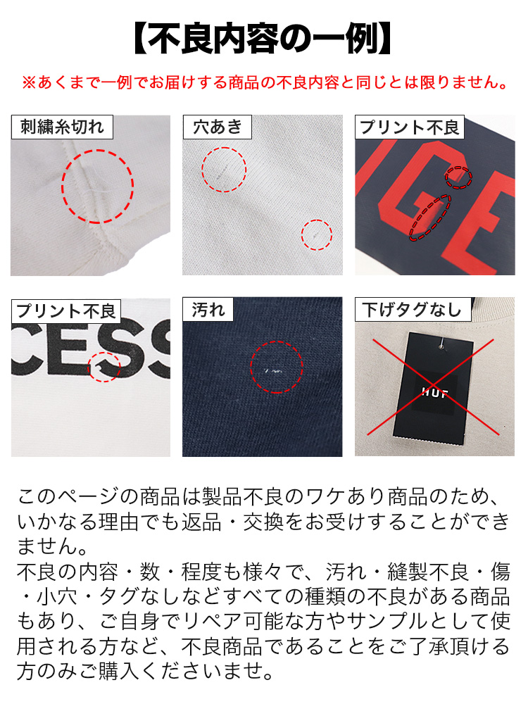 不良の内容・数・程度も様々で、汚れ・縫製不良・傷・タグ欠損などすべての種類の不良がある商品もあり、ご自身でリペア可能な方やサンプルとして使用される方など、不良商品であることをご了承頂ける方のみご購入くださいませ。