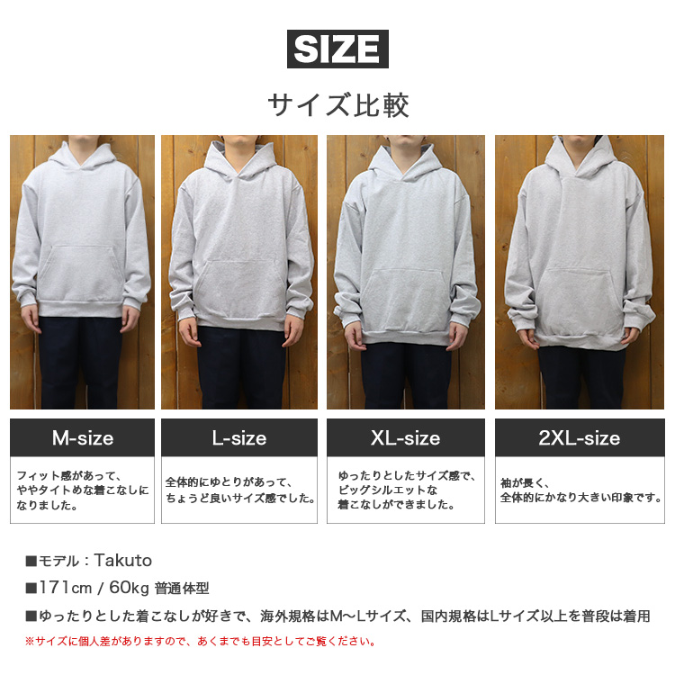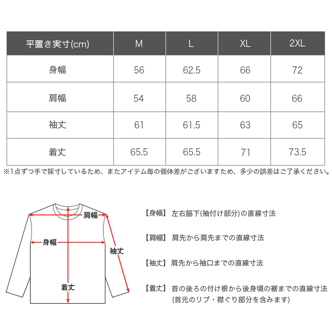 平置き実寸(cm)[身幅/肩幅/袖丈/着丈]:Mサイズ 56/54/61/65.5・Lサイズ 62.5/58/61.5/65.5・XLサイズ 66/60/63/71・2XLサイズ 72/66/65/73.5 ※多少の誤差はご了承ください