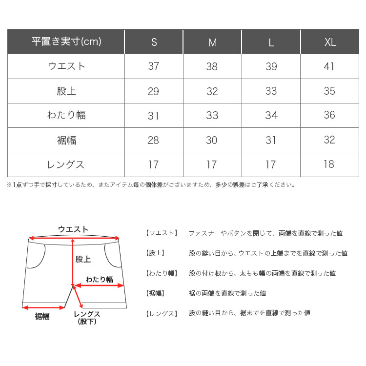 平置き実寸(cm)[ウエスト/股上/わたり幅/裾幅/股下]:Sサイズ 37/29/31/28/17・Mサイズ 38/32/33/30/17・Lサイズ 39/33/34/31/17・XLサイズ 41/35/36/32/18 ※多少の誤差はご了承ください