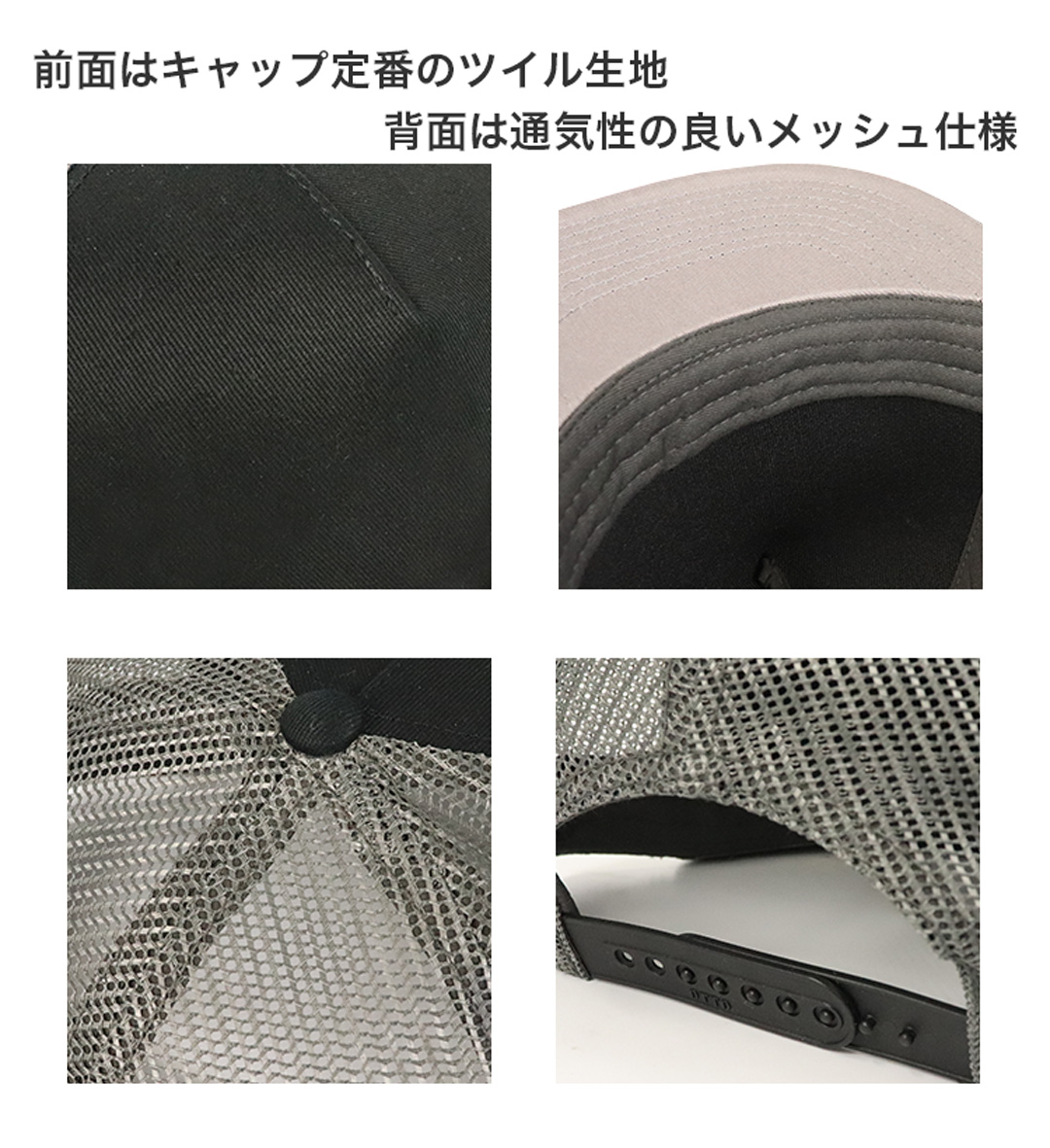前面はキャップ定番のツイル生地、背面は通気性の良いメッシュ仕様。グレーのアンダーバイザーとフラットバイザーが特徴、カジュアルからストリートまで幅広いファッション・コーデに対応。