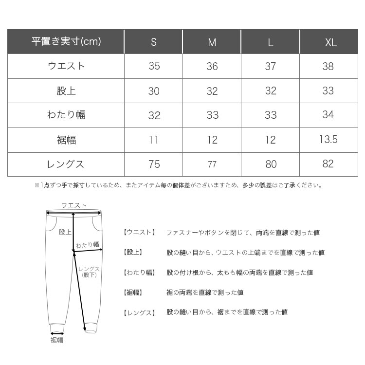 平置き実寸(cm)[ウエスト/股上/わたり幅/裾幅/股下]:Sサイズ 35/30/32/11/75・Mサイズ 36/32/33/12/77・Lサイズ 37/32/33/12/80・XLサイズ 38/33/34/13.5/82 ※多少の誤差はご了承ください