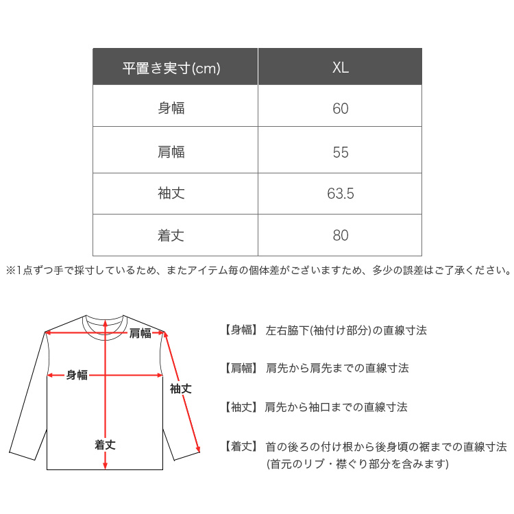 平置き実寸(cm)[身幅/肩幅/袖丈/着丈]:XLサイズ 60/56/65/77 ※多少の誤差はご了承ください