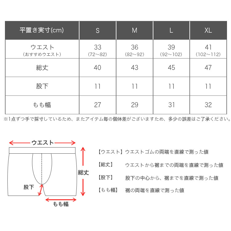 平置き実寸(cm)[ウエスト/総丈/股下/もも幅]:Sサイズ 33/40/11/27・Mサイズ 36/43/11/29・Lサイズ 39/45/11/31・XL:41/47/11/32 ※多少の誤差はご了承ください ※日本サイズの1~2サイズほど大きめに作られております