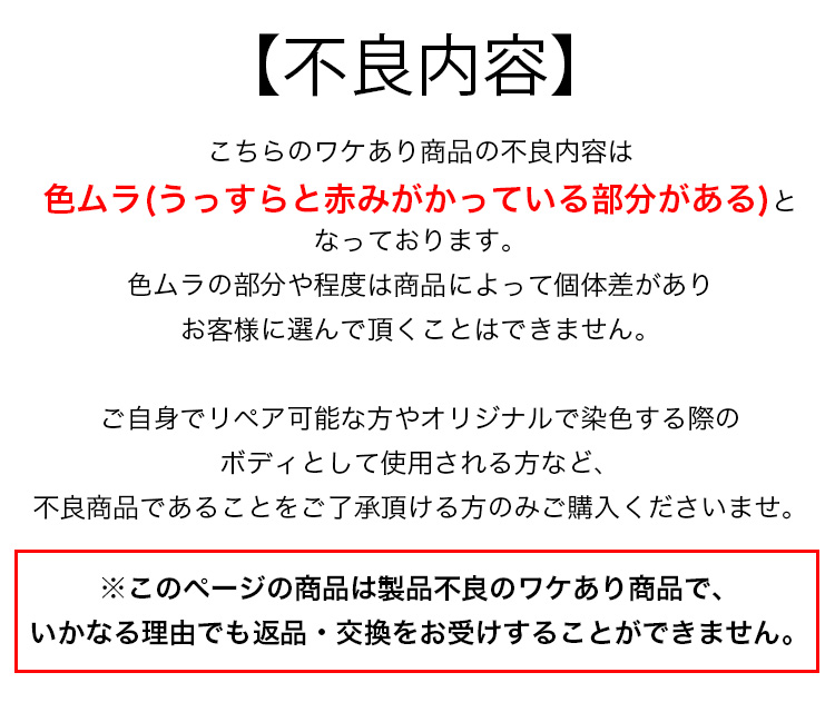 こちらの商品の不良内容は色ムラ(うっすらと赤みがかっている部分がある)となっております。ご自身でリペア可能な方やオリジナルで染色する際のボディとして使用される方など、不良商品であることをご了承頂ける方のみご購入くださいませ。