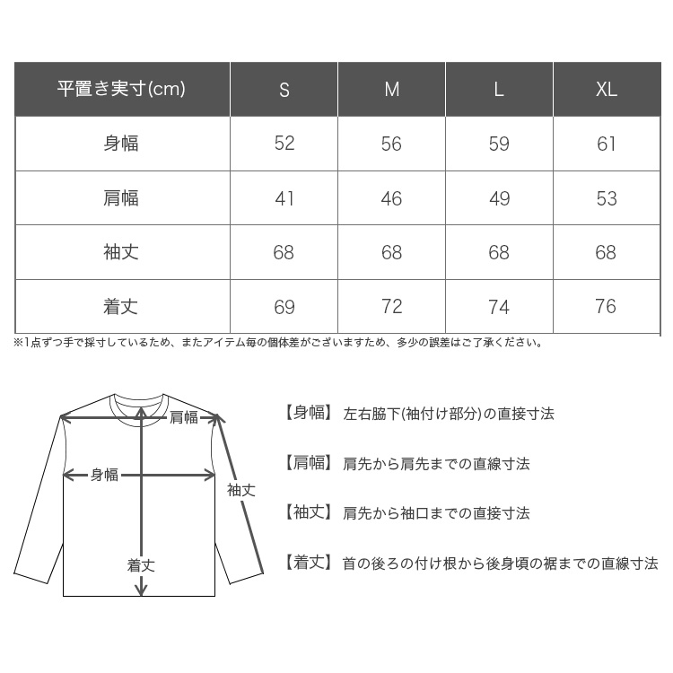 平置き実寸(cm)[身幅/肩幅/袖丈/着丈] S:52/41/68/69・M:56/46/68/72・L:59/49/68/74・XL:61/53/68/76 ※多少の誤差はご了承ください